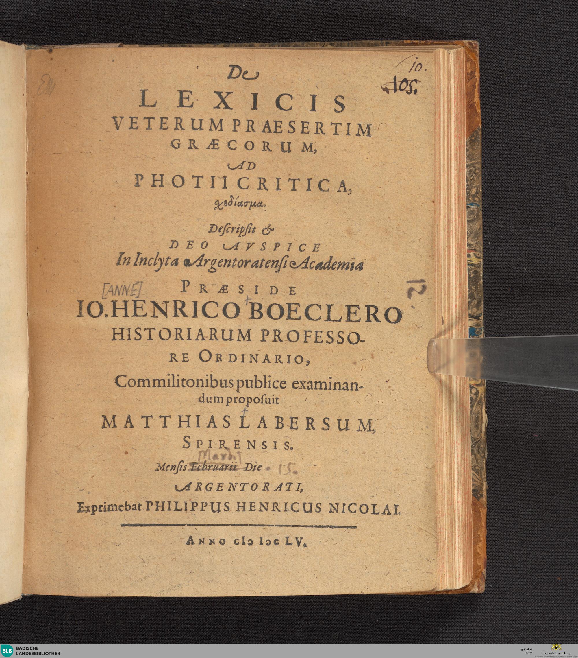 De lexicis veterum praesertim Graecorum, ad Photii critica, schediasma / Descripsit & ... In Inclyta Argentoratensi Academia Praeside Io. Henrico Boeclero ... Commilitonibus publice examinandum proposuit Matthias Labersum, Spirensis