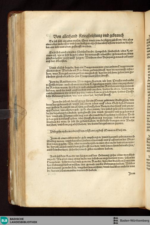Fünff Bücher, Vonn Kriegs Regiment vnd Ordnung, Wie sich ein jeder Kriegszmann inn seinem Ampt vnnd Beuelch halten soll, was zu anfang eines Kriegs zuerwegen vnnd zubetrachten sey, Auch vonn vielerley beuelch vnnd ämptern, vom höchsten biß auff das niderst, was eines jeden Herrn oder Potentaten, als General Obersten, Kriegßräth, Musterherren, Commissarien, Pfenningmeysters, Obersten Feldprofosen, Prouand vnd Quartiermeysters, deßgleichen Herold, Schreibers, [et]c. Aydt vn[d] Ampt sey, vnd was in ein Zeughauß gehöre zu einem Feldtzug zugebrauchen. Jtem was die Arckelley vnd Munition belangt, wie das Geschütz, Kuglen, Pulffer vnd Reyßwägen in gutter ordnung eins auffs ander gefürt werden soll. Von dem Reysigen zeug, Fußuolck vnd jren ämptern, Artickelsbrieff, vnd wie Schlachtordnungen zu Roß vnd Fuß gemacht werden. Jtem von belägerungen vnd besatzungen der Stett, Schlösser, Märckten vnd Bergheusern - Cod. Rastatt 14 : Mit schönen Figuren / Alles getrewlich vnd eygentlich in fünff Bücher verfaßt vnnd an Tag geben, Durch Lienhart Frönsperger