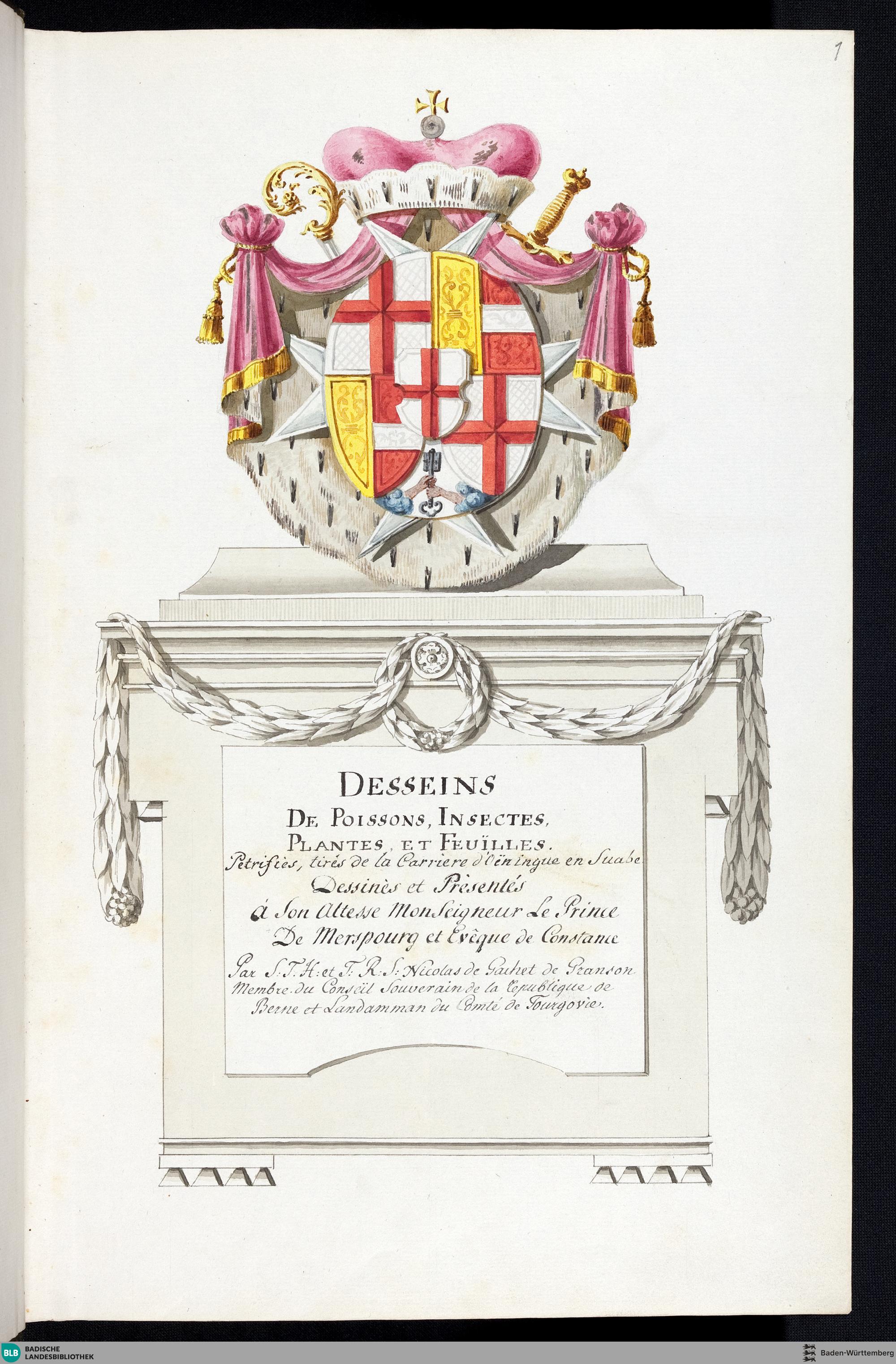 Text: "Desseins de Poissons, Insectes, Plantes, et Feuilles Petrifies, tirés de la Carriere d'Oeningue en Suabe. Dessinès et Prèséntes á Son Altesse MonSeigneur le Prince de Merspourg et Evêque de Constance Par S.T.H. et T.R.S. Nicolas de Gachet de Pranson Membre du Conseil Souverain de la Republique de Berne et Landammann du Comté de Tourgovie"