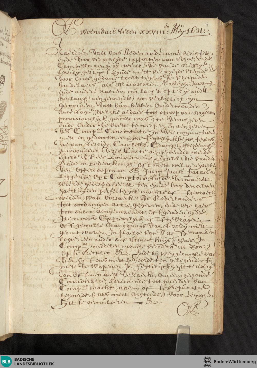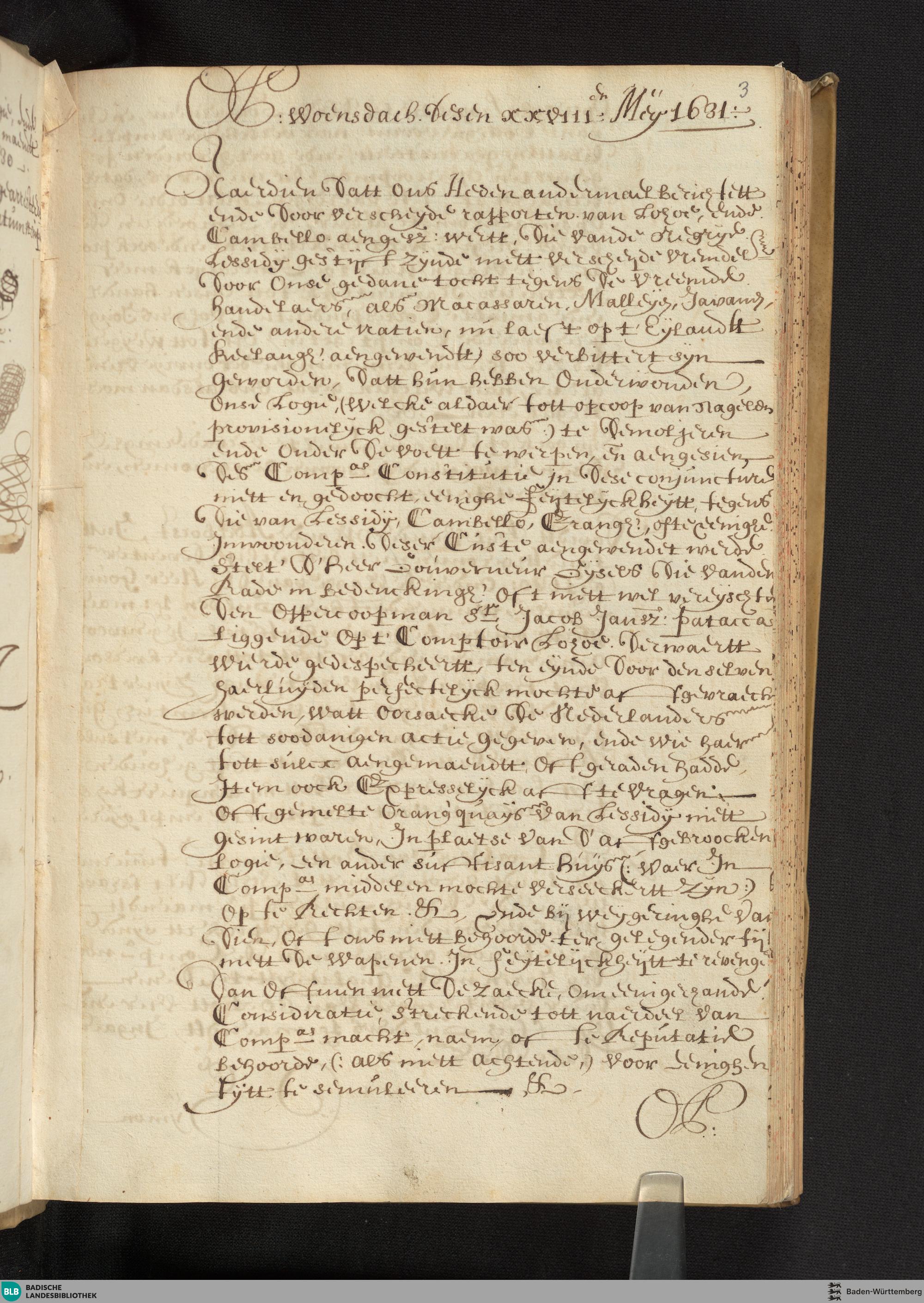 Cod. Karlsruhe 491 (1601) Resolutieboek van den Gouverneur Artus Gijsels geduerende zijn E. Gouverne 1631 inde Quartieren van Amoyna. 27 Mai 1631 - 3 Junij 1634 - Cod. Karlsruhe 491