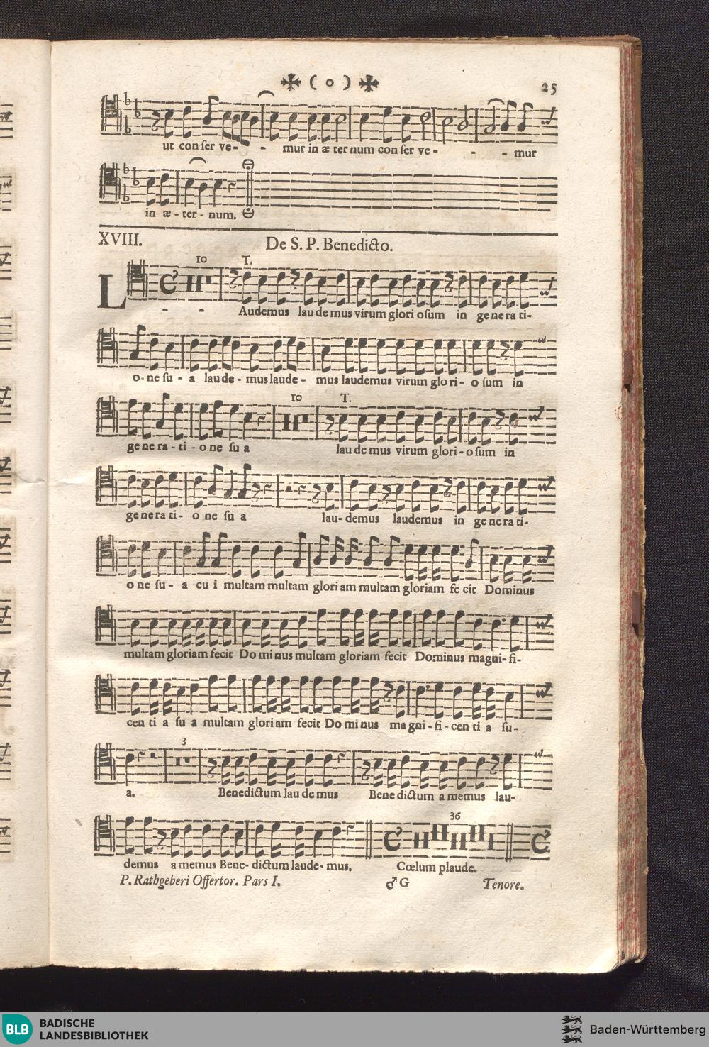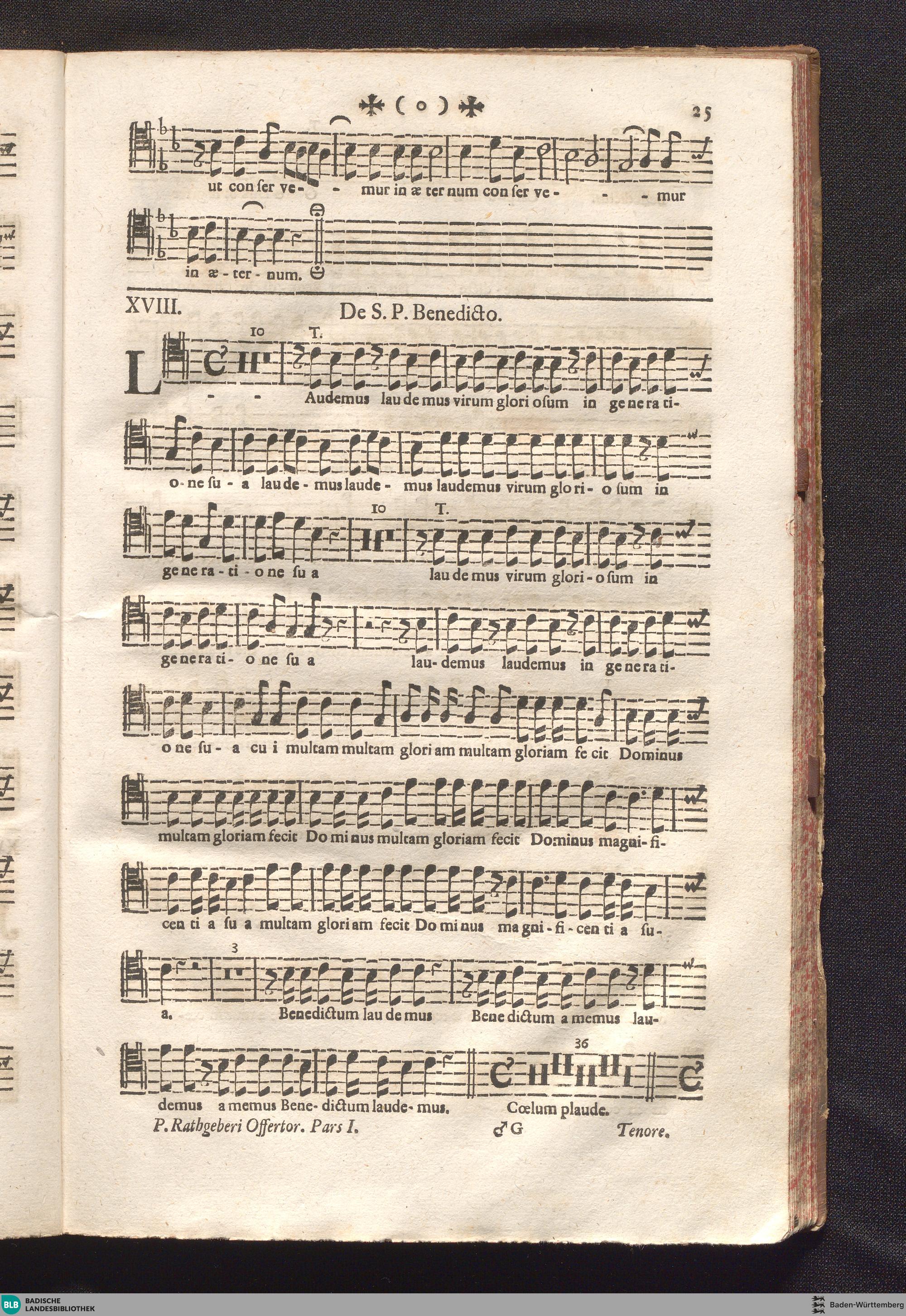 Pars 1 (1734) Complectitur Offertoria XX. Ab Adventu Usque Ad Pascha Exclusive : Cum Appendice VI. Antiphon. Stella Coeli &c. De B. V. Maria : à Canto, Alto, Tenore, Basso, II. Violinis & Organo necessariis, Violoncello, Tubis vel Lituis, ac Tympano in solennioribus Festis ad Libitum adhibendis