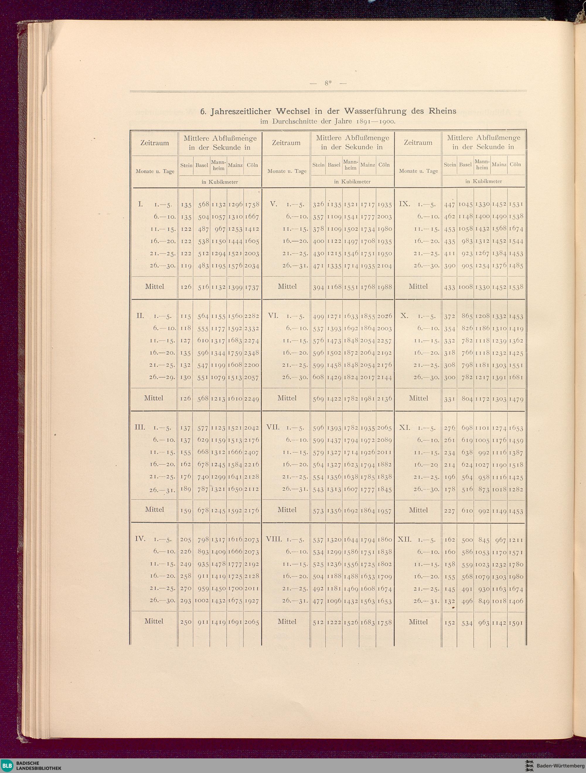 Tabelle: 6. Jahreszeitlicher Wechsel in der Wasserführung des Rheins im Durschschnitte...