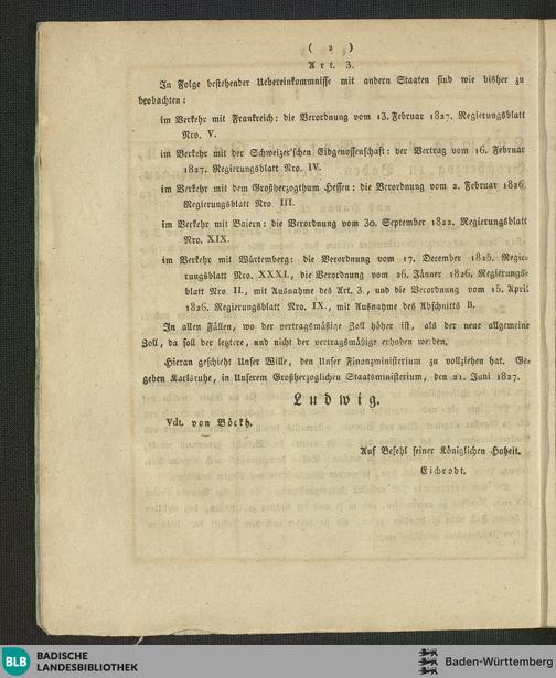 Großherzoglich Badische Zoll-Gesetzgebung 1827 : [Gegeben Karlsruhe, in Unserem Großherzoglichen Staatsministerium, den 21. Juni 1827] / [Ludwig von Gottes Ganden, Großherzog zu Baden...]