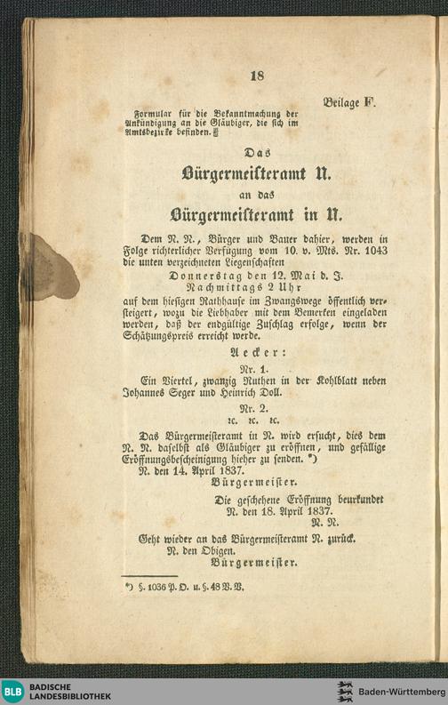 Kurzer Auszug aus der Process-Ordnung und den Vollzugs-Vorschriften vom 29. März 1832 ... über das Verfahren bei Zwangs-Versteigerungen unbeweglicher Güter : zur bessern Uebersicht und Belehrung für die Vorgesetzten des Oberamtsbezirks Durlach / entworfen von dem Amtsrevisorat allda