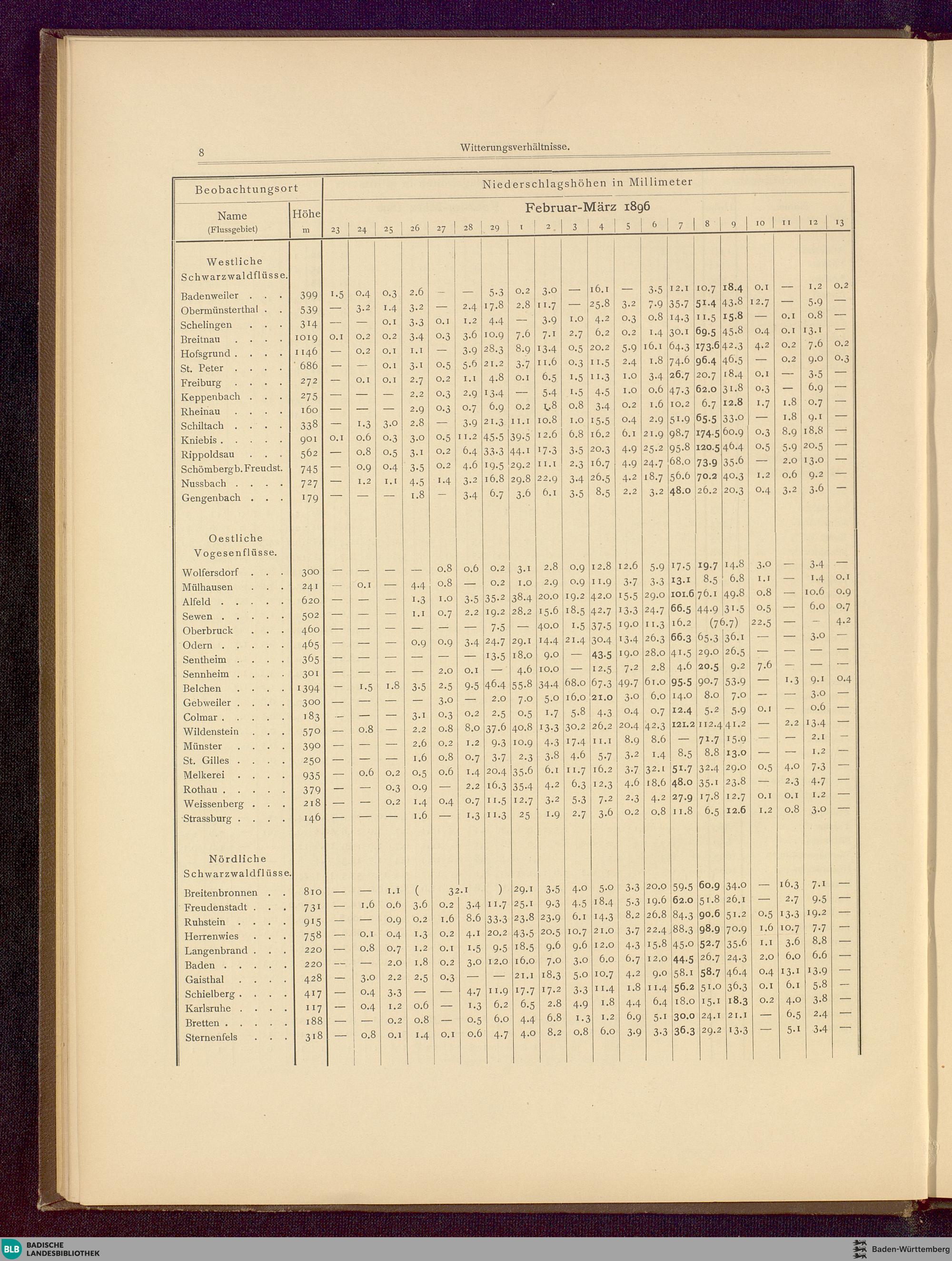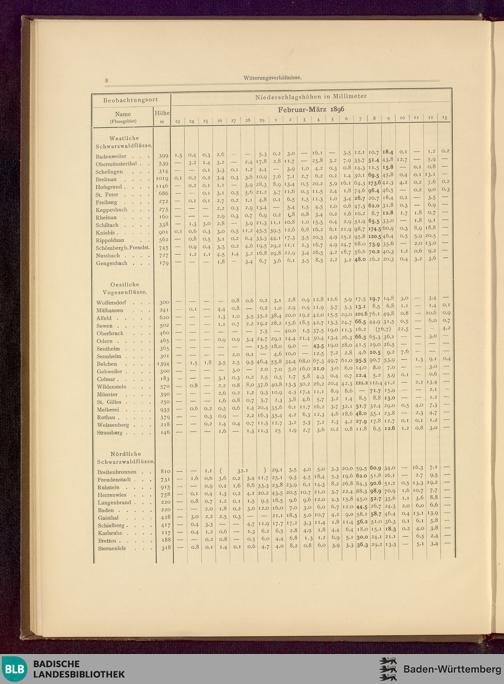 Karte: Tafel I. Uebersichs-Karte über die Vertheilung der Niederschläge im Rheingebiet am 7., 8. und 9. März 1896