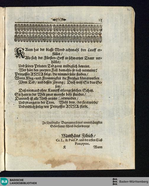 Christlicher Seelen zeitliche Angst und seelige Überwindung deroselben bey höchsttraurigem Hintritt der durchläuchtigsten Fürstin Prinzessin Annae, Marggräfin zu Baden und Hochberg, ... welche den 15. Octobr. ...1672 ... aus dieser Welt abgeschieden / in einer Leich-Sermon ... in den Truck gegeben von Jo. Fechten