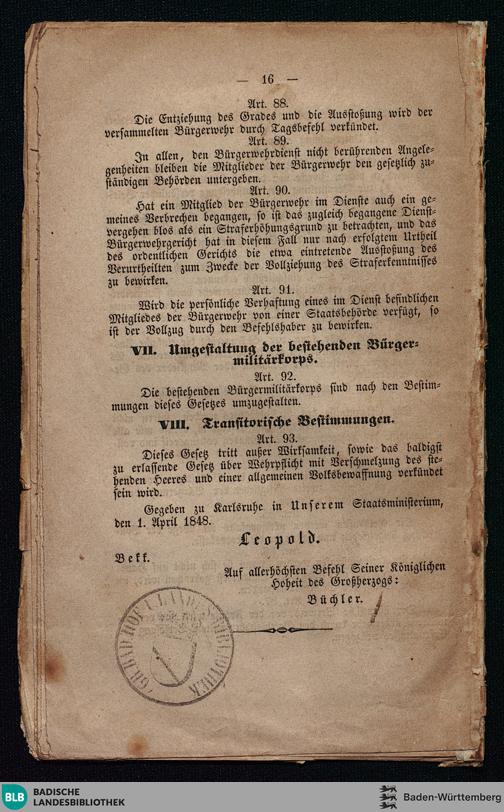 Gesetz über die Errichtung der Bürgerwehr im Großherzogthum Baden / [Leopold, von Gottes Gnaden Großherzog von Baden ...]