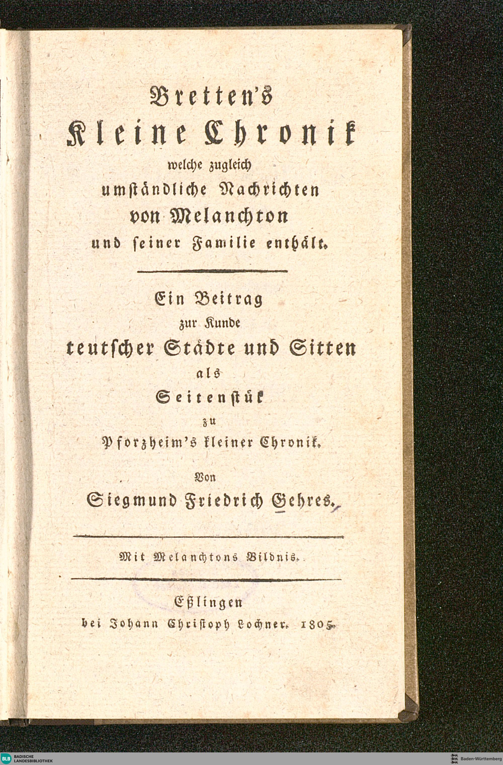 Bretten's Kleine Chronik : welche zugleich umständliche Nachrichten von Melanchton und seiner Familie enthält; ein Beitrag zur Kunde teutscher Städte und Sitten als Seitenstük zu Pforzheim's kleiner Chronik; mit Melanchtons Bildnis / von Siegmund Friedrich Gehres