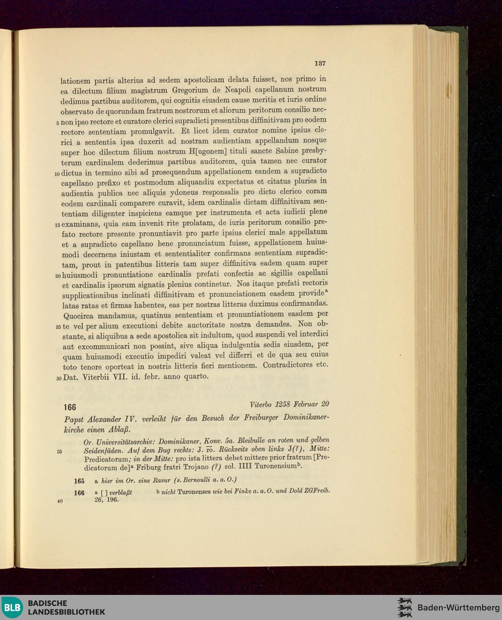166 - Viterbo 1258 Februar 20: Papst Alexander IV. verleiht für den Besuch der Freiburger...