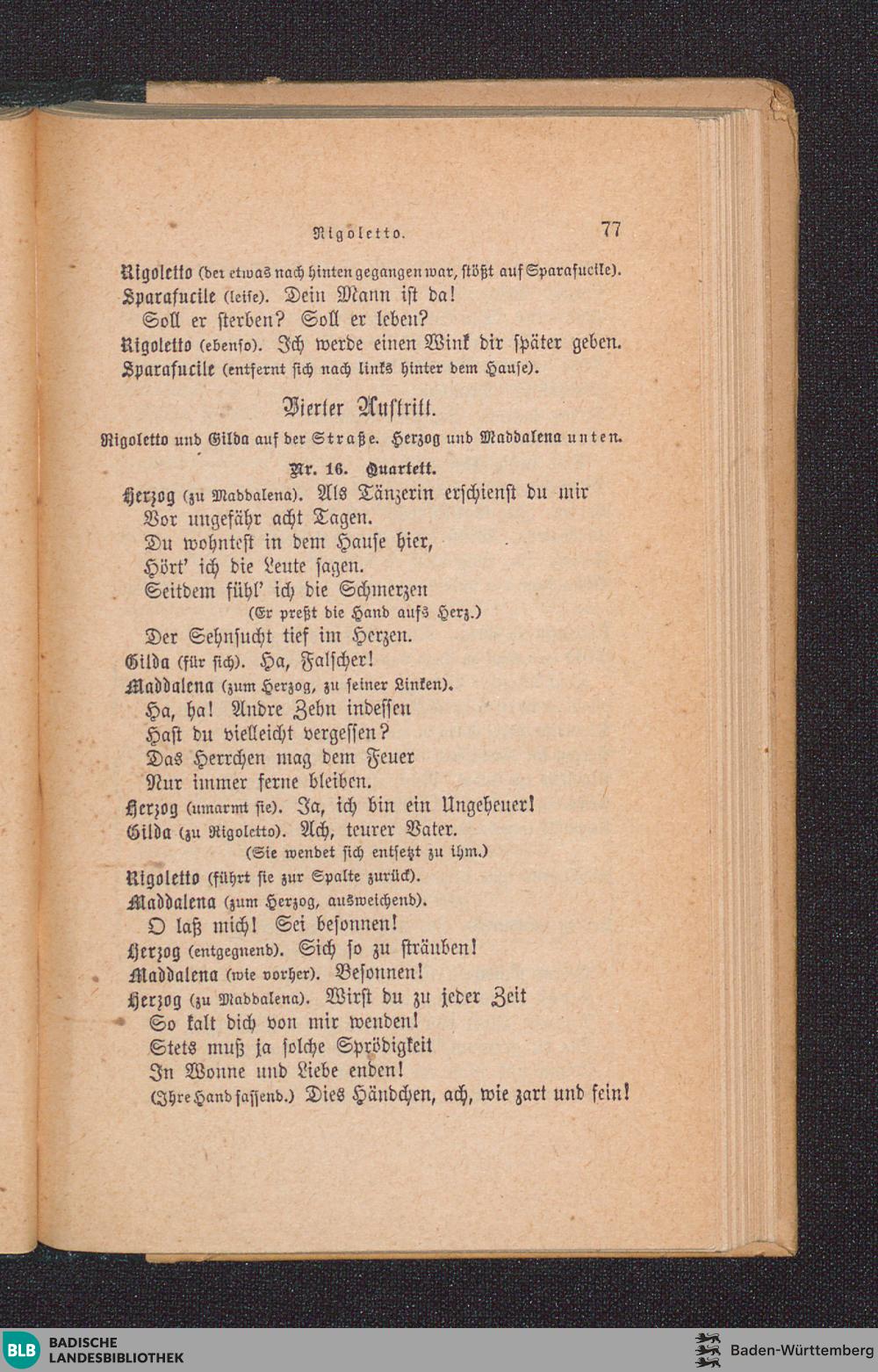 Rigoletto : Oper in vier Aufzügen; vollständiges Buch / von Giuseppe Verdi. Dichtung von Francesco Maria Piave. [Übers. von] (Johann Christoph Grünbaum). Durchgesehen u. hrsg. von Carl Friedr. Wittmann