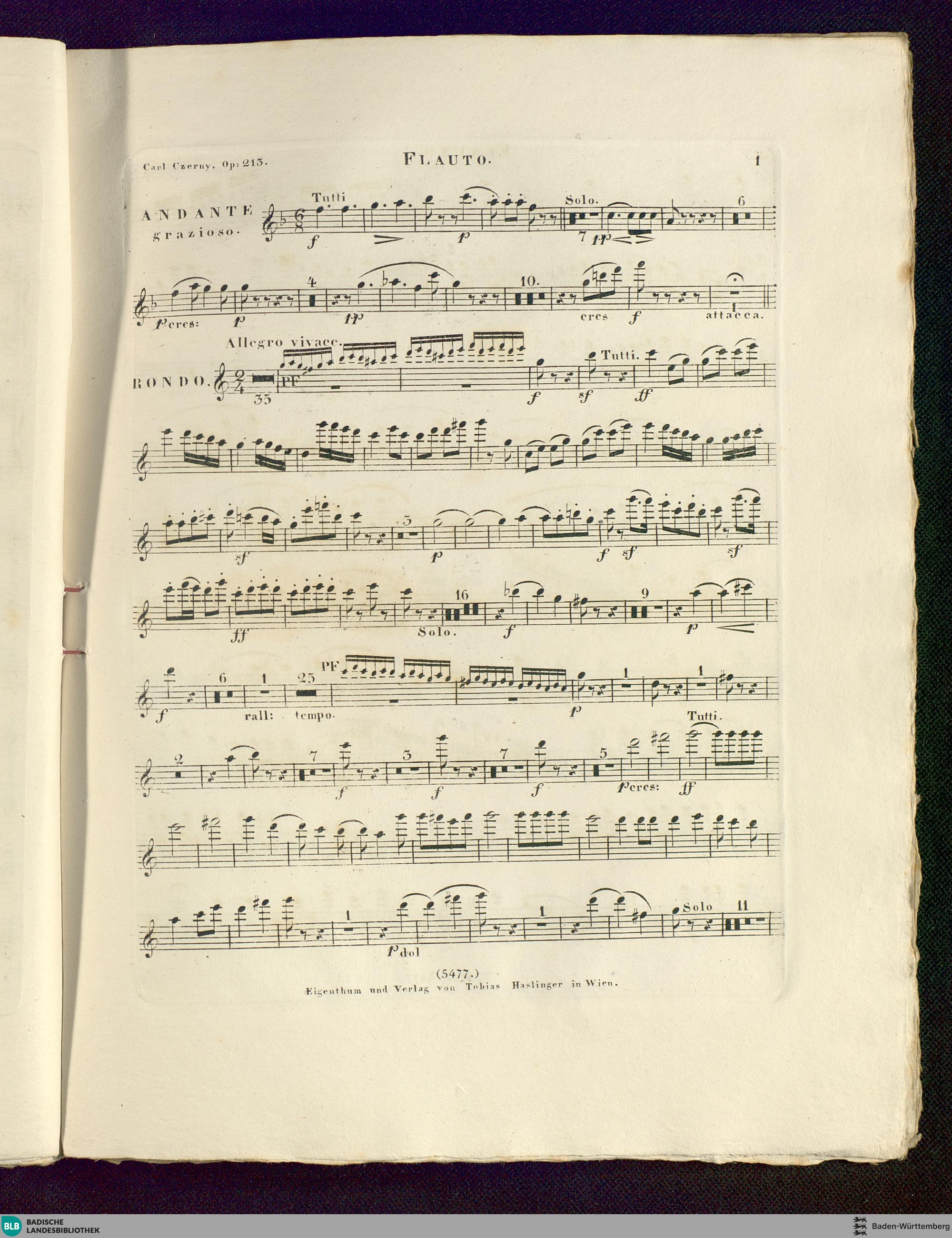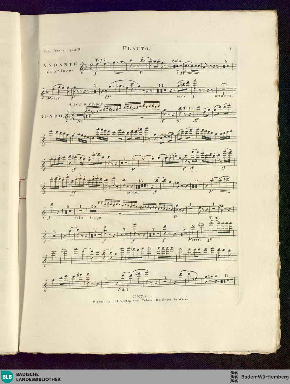 Andante und Rondo für das Piano-Forte : mit Begleitung von 2 Violinen, Viola, Violoncello und Contrabass nebst Flöte, 2 Hoboen oder Clarinetten, 2 Fagotten, 2 Hörnern, 2 Trompeten und Pauken (ad libitum); 213tes Werk / von Carl Czerny