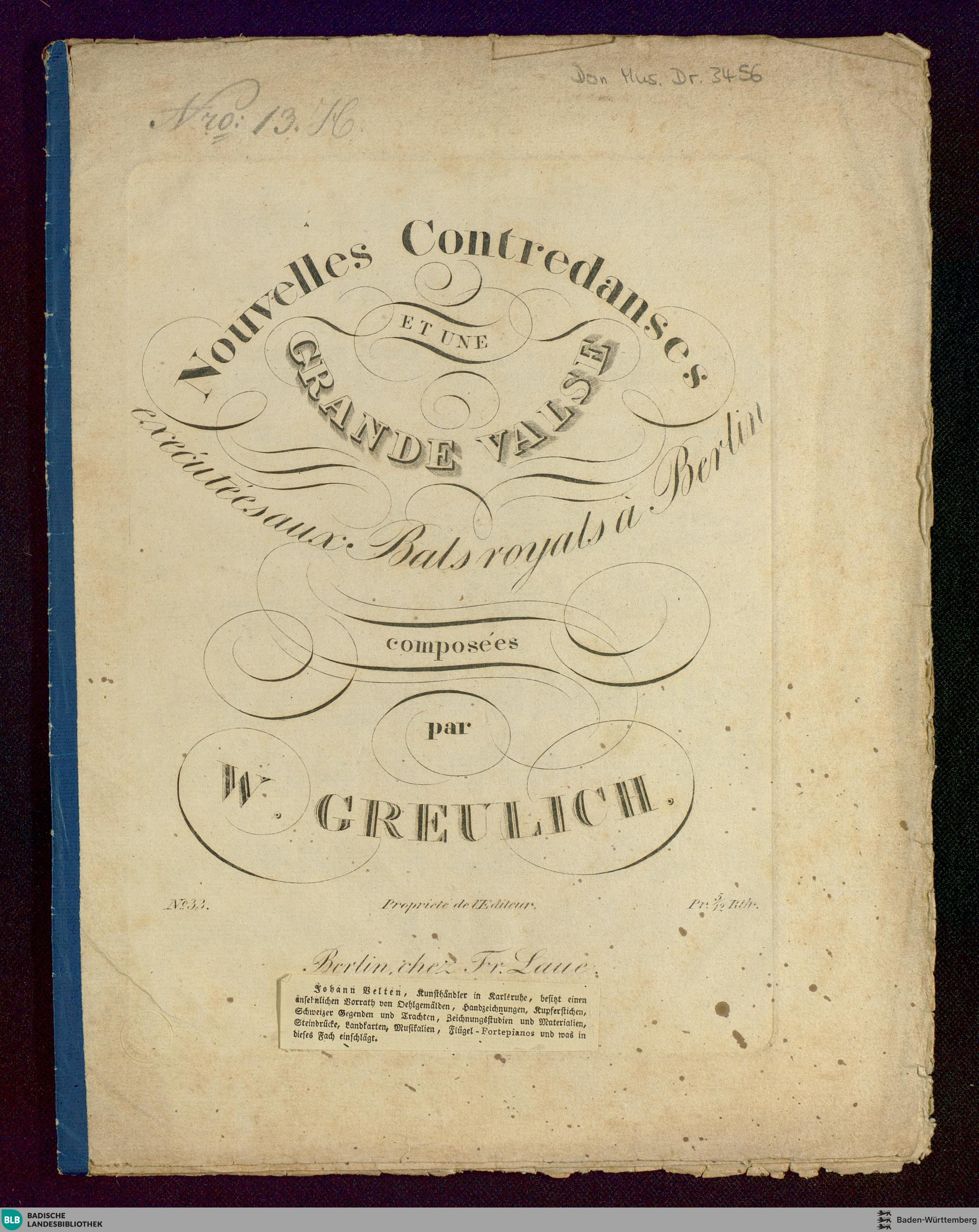 Nouvelles contredanses et une grande valse exécutéesaux bals royals à Berlin / composées par W. Greulich