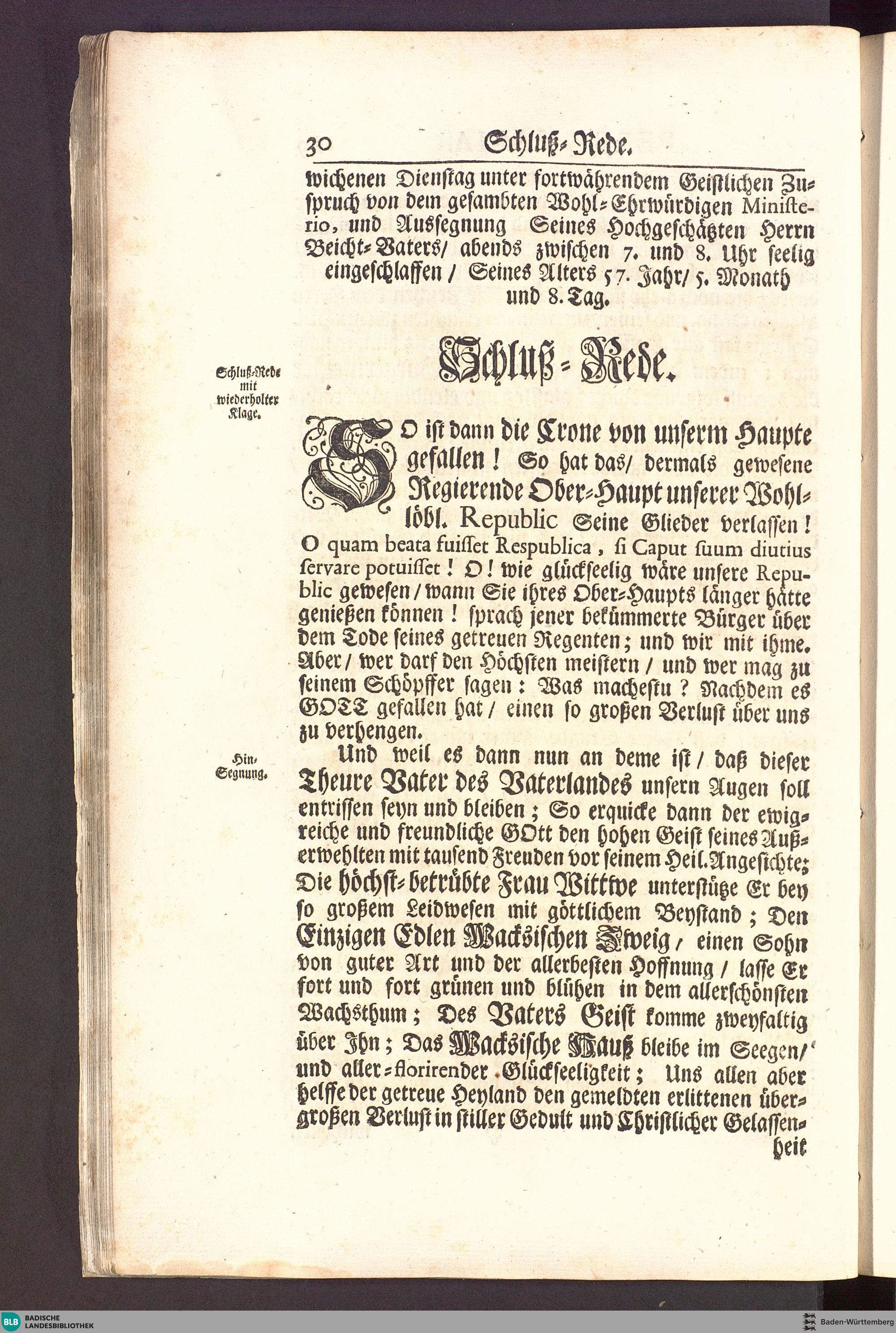 Der Unerschrockene Muth der Glaubigen, Wie in dem Leben, also in dem Sterben : ... Bey Hochansehnlicher Leichen-Bestattung Des ... Herrn Adam Christian Wacksen, Gewesenen Utriusq. Juris ... Doctoris ... Regierenden Burgermeisters Dieser ... Freyen Stadt Heilbronn ... Welcher ... den 17. Junii 1732 wiederum seelig in dem Herrn entschlaffen / vorgestellet von Johann-Georgio Dietz