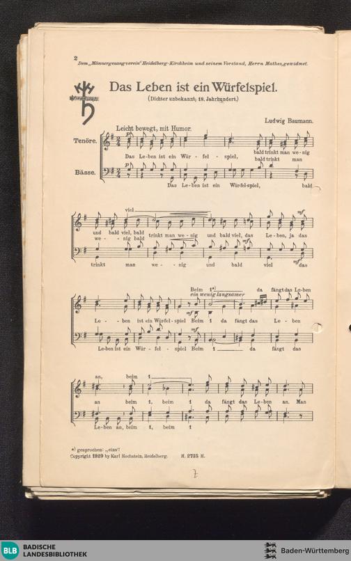 Das Leben ist ein Würfelspiel : für Männerchor / komponiert von Ludwig Baumann ; Dichter unbekannt, 18. Jahrh.
