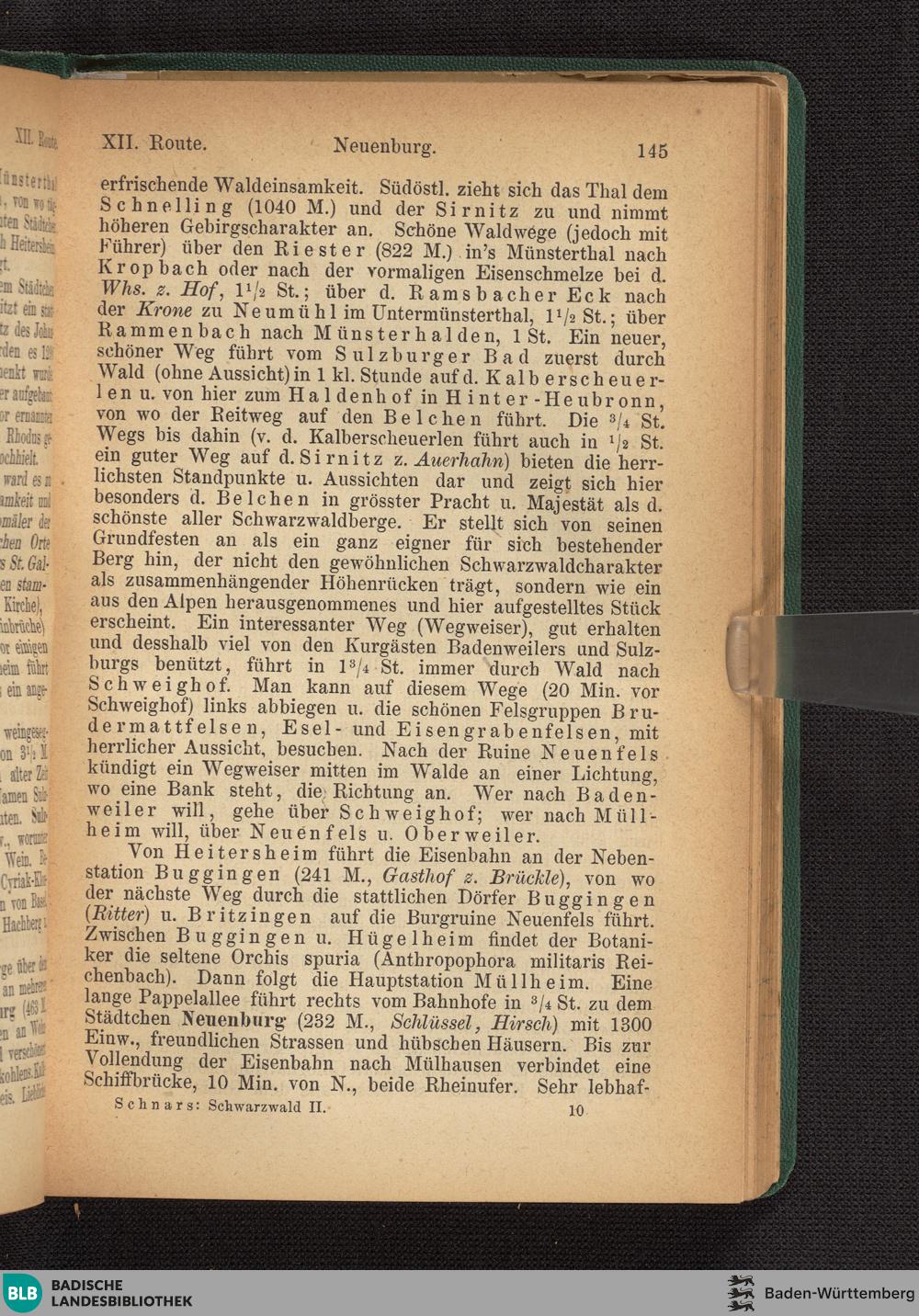 2 (1876) Der südliche Schwarzwald : der Schwarzwald von Offenburg über Waldkirch, Furtwangen, Lenzkirch, Neustadt, St. Blasien, Höchenschwand u.s.w. bis zum Randengebirge; Freiburg und Umgebung, der Kandel, der Feldberg, der Belchen, der Blauen, die Thäler der Dreisam, Wiese, Wehra, Murg, Alb, Schlücht, Wutach u.s.w. ; Basel, Säckingen, Waldshut, Schaffhausen, der Rheinfall, Heiligenberg, Sigmaringen und das Donauthal ; mit drei Karten, dem Plan von Freiburg und einem Alpen-Panorama von Höchenschwad aus