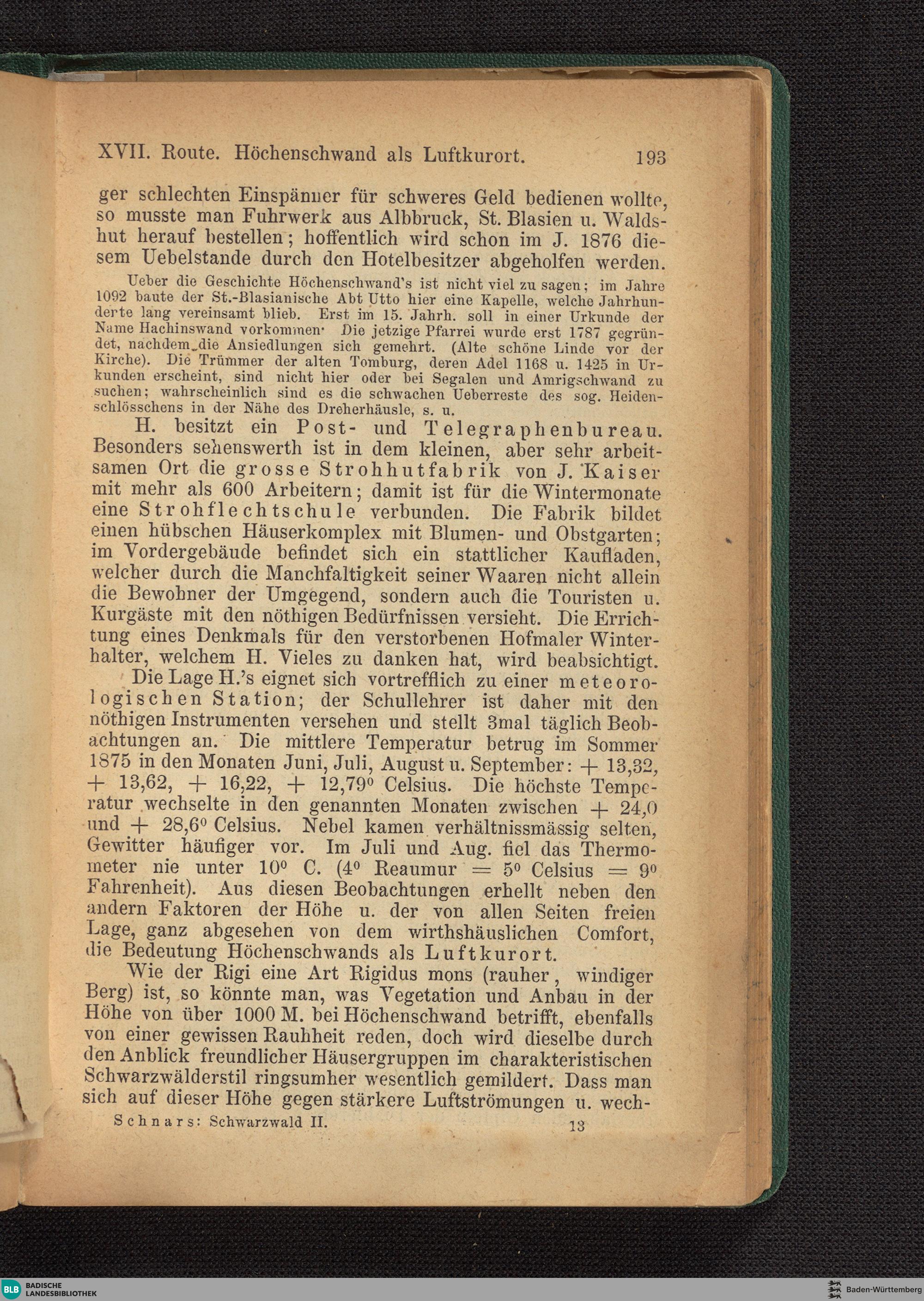 2 (1876) Der südliche Schwarzwald : der Schwarzwald von Offenburg über Waldkirch, Furtwangen, Lenzkirch, Neustadt, St. Blasien, Höchenschwand u.s.w. bis zum Randengebirge; Freiburg und Umgebung, der Kandel, der Feldberg, der Belchen, der Blauen, die Thäler der Dreisam, Wiese, Wehra, Murg, Alb, Schlücht, Wutach u.s.w. ; Basel, Säckingen, Waldshut, Schaffhausen, der Rheinfall, Heiligenberg, Sigmaringen und das Donauthal ; mit drei Karten, dem Plan von Freiburg und einem Alpen-Panorama von Höchenschwad aus