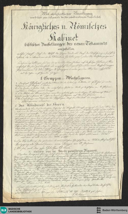 Mit obrigkeitlicher Bewilligung wird hier zum Erstenmale die Ehre gehabt werden, ein Kayserliches, Königliches u. Römisches Kabinet biblischer Darstellungen des neuen Testaments auszustellen