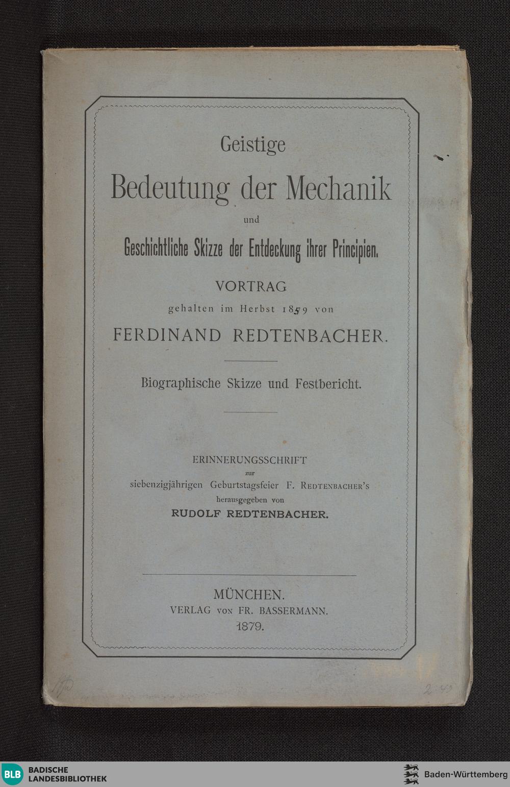 Geistige Bedeutung der Mechanik und Geschichtliche Skizze der Entdeckung ihrer Principien : Vortrag gehalten im Herbst 1859 / von Ferdinand Redtenbacher. Hrsg. von Rudolf Redtenbacher