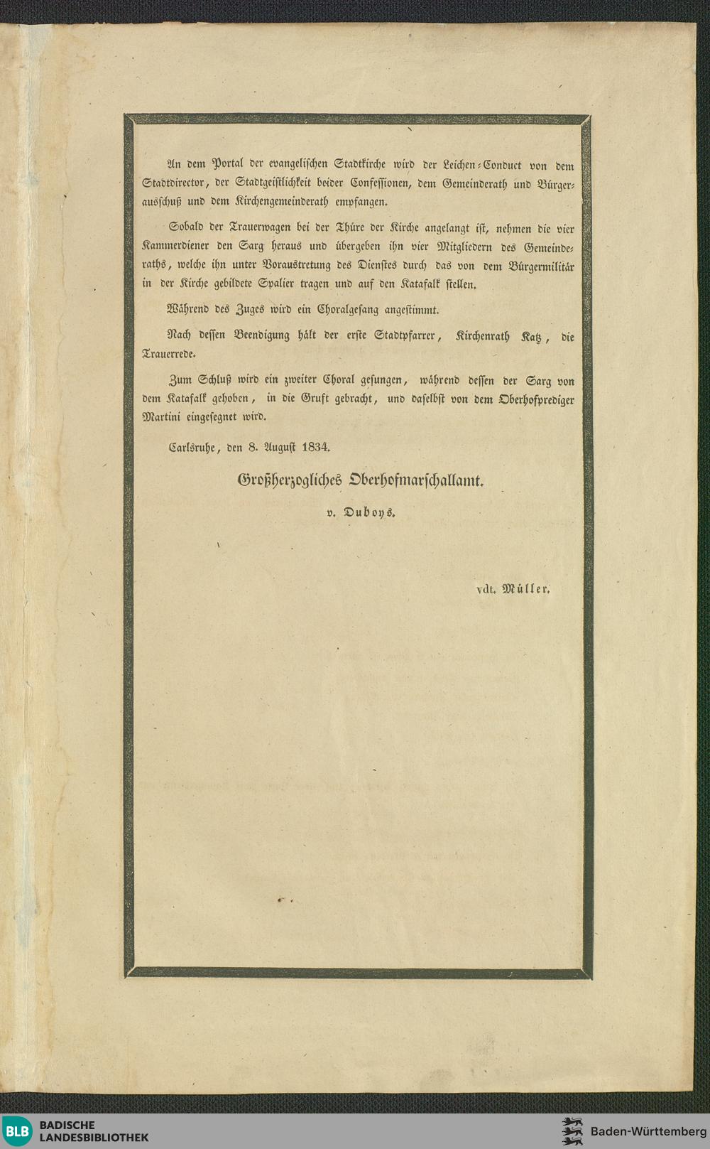 Programm über das feierliche Leichenbegängniß Ihrer Hoheit der Prinzessin Wilhelmine Pauline Henriette Leopoldine Sophie Amalie Maximiliane Markgräfin von Baden, Tochter Seiner Hoheit des Herrn Markgrafen Wilhelm