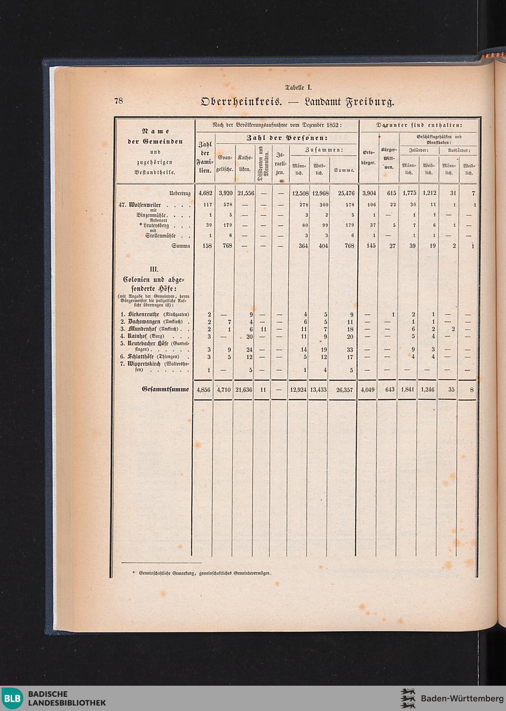 Tabelle I. Übersicht der Gemeinden, Colonien und abgesonderten Höfe mit Angabe der...