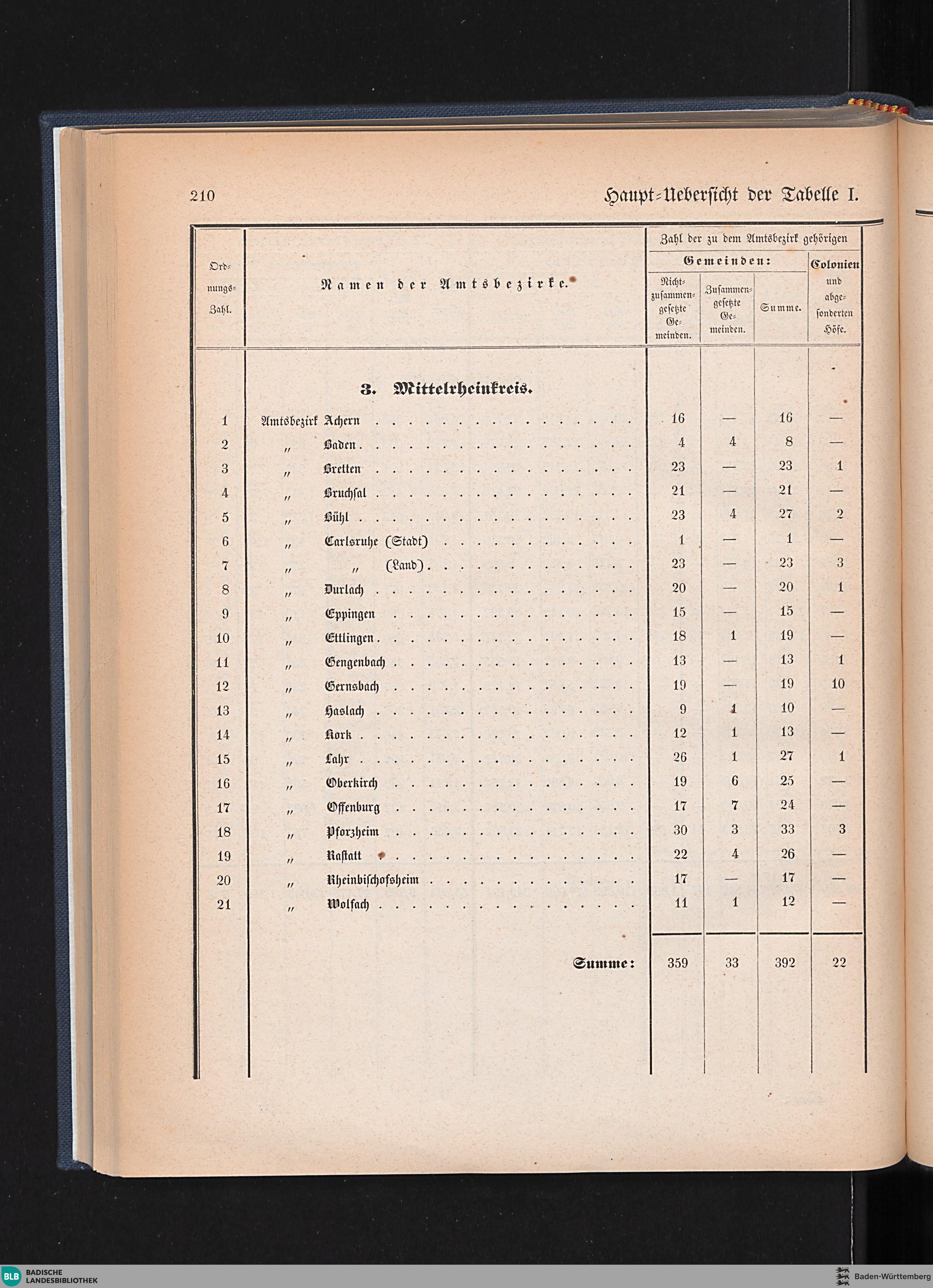 Haupt-Uebersicht der Tabelle I. für den Mittelrheinkreis