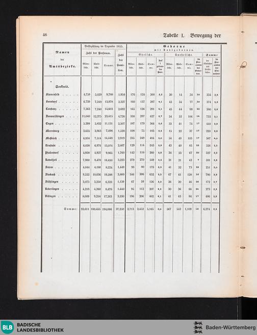 Tabelle I. Bewegung der Bevölkerung im Großherzogthum Baden in den Jahren 1852, 1853,...