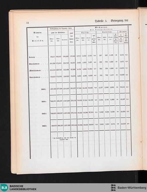 Tabelle I. Bewegung der Bevölkerung im Großherzogthum Baden in den Jahren 1852, 1853,...