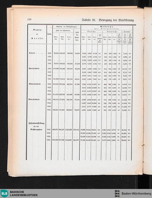 Tabelle III. Bewegung der Bevölkerung in den Jahren 1852, 1853, 1854 und 1855. Nach...