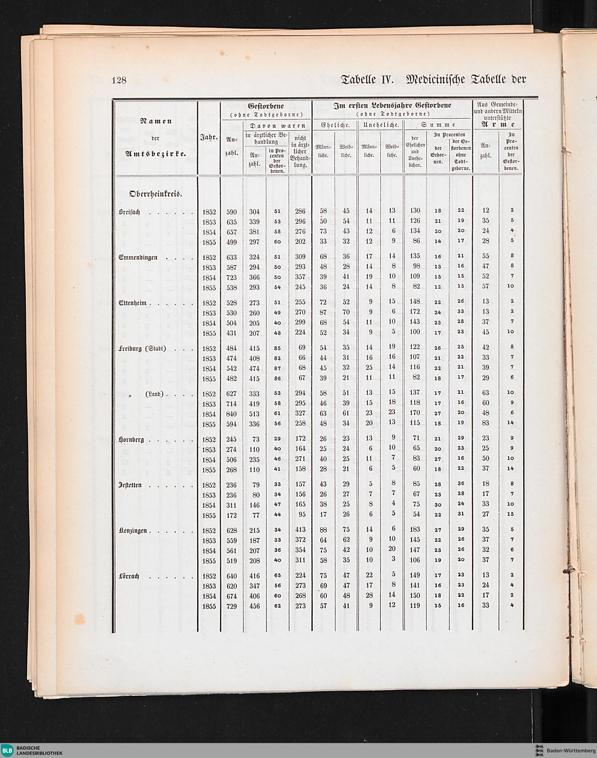 Tabelle IV. Medicinische Tabelle der Jahre 1852, 1853, 1854 und 1855. Nach den Amtsbezirken...