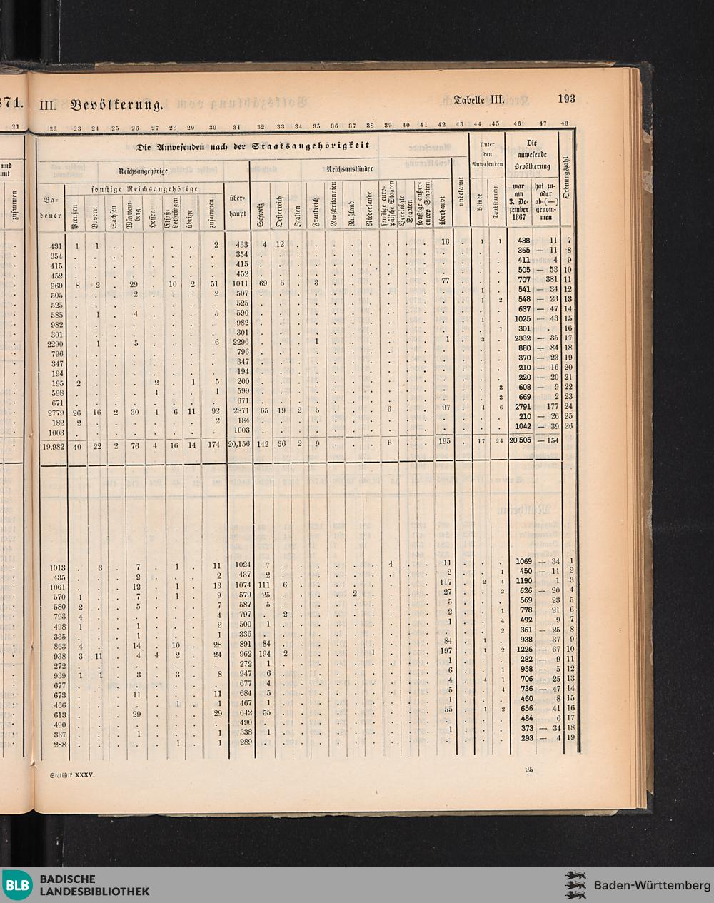 III. Uebersicht der anwesenden Bevölkerung nach Geschlecht, Religion und Staatsangehörigkeit,...