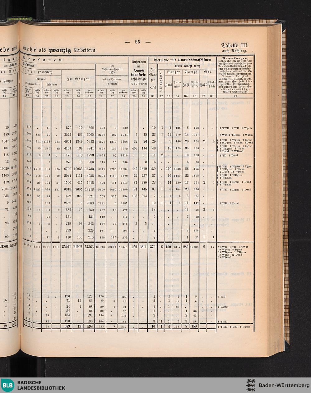 Tabelle III. Die Gewerbebetriebe mit mehr als 20 Arbeitern, deren Personal und motorische...
