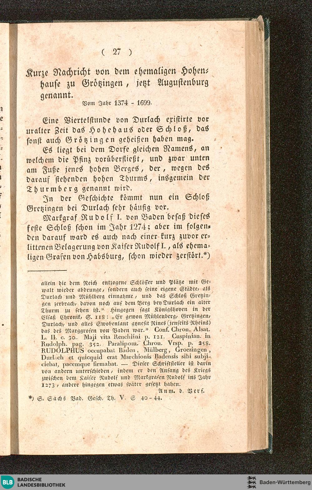 Kurze Nachricht von dem ehemaligen Hohenhause zu Grötzingen, jetzt Augustenburg ...