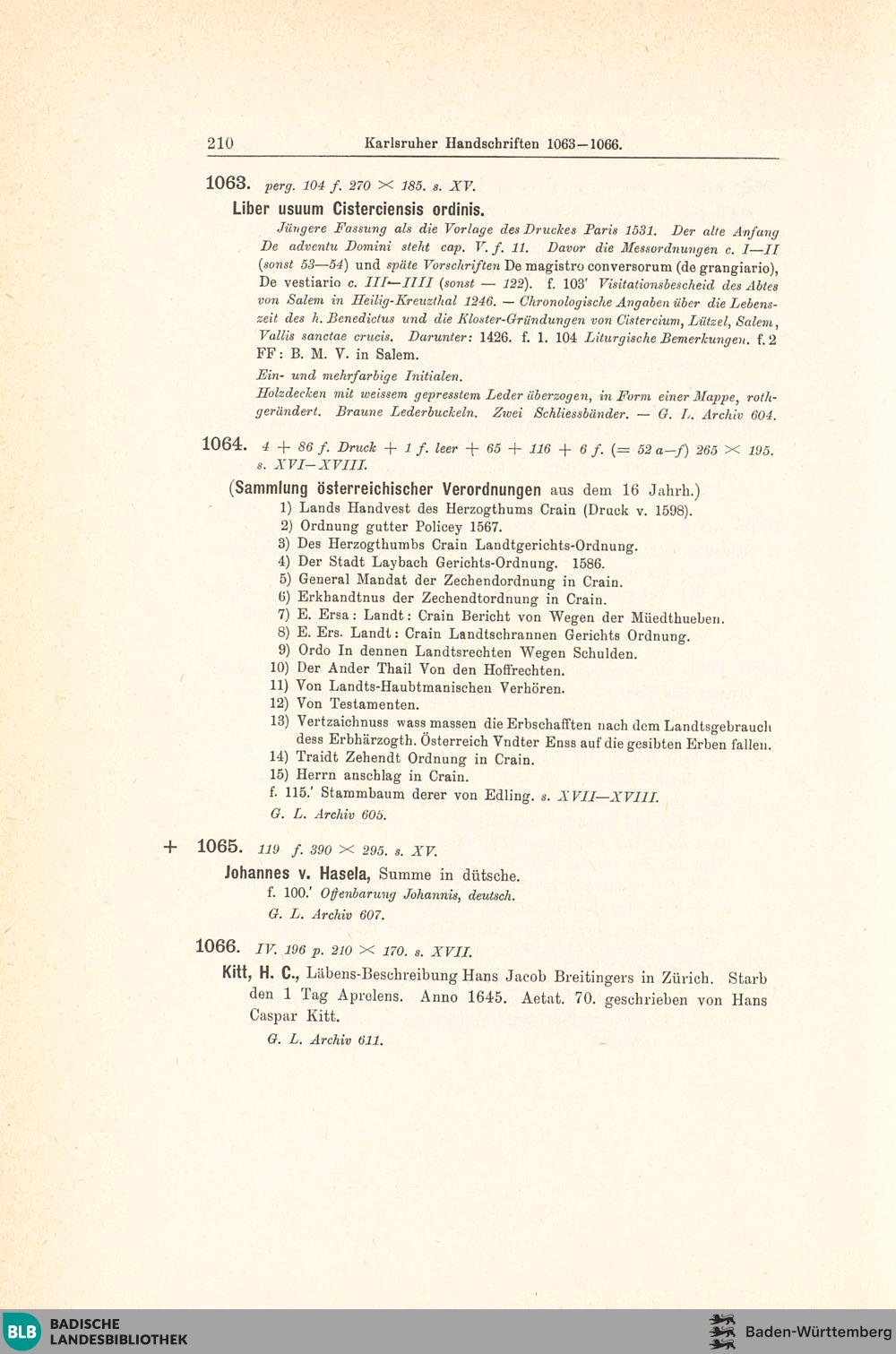 4 : Die Karlsruher Handschriften ; Bd. 1 (1970) Nr. 1 - 1299 / Mit e. Vorw. v. Wilhelm Brambach