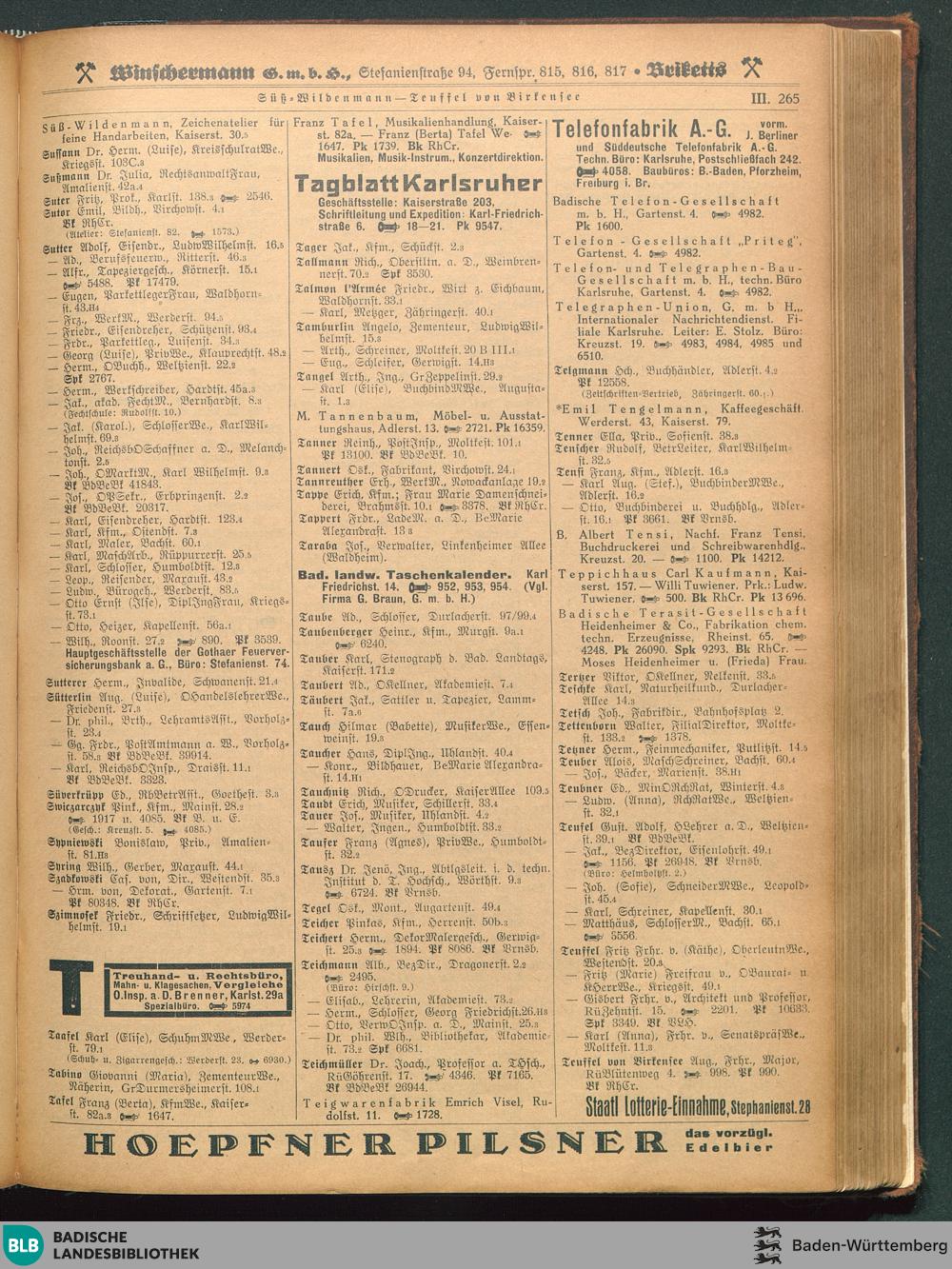 Adressbuch (Stadtbuch, Einwohnerbuch) der Landeshauptstadt Karlsruhe