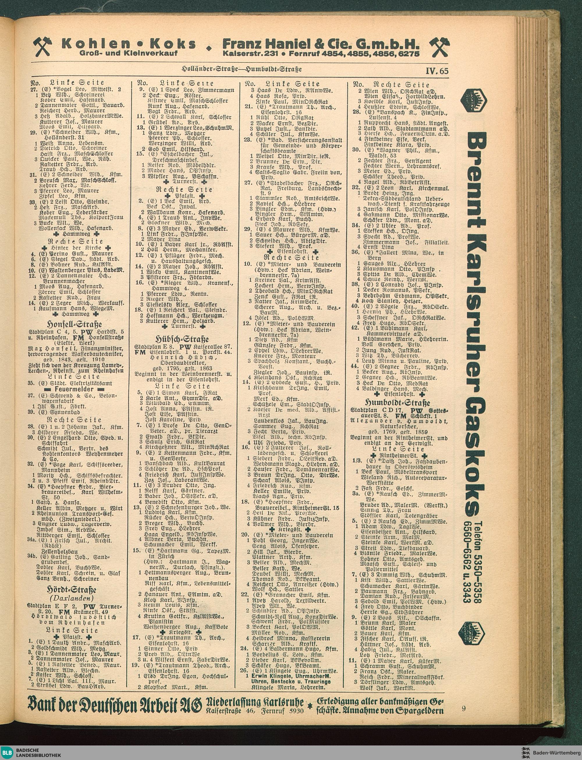 Adressbuch (Stadtbuch, Einwohnerbuch) der Landeshauptstadt Karlsruhe