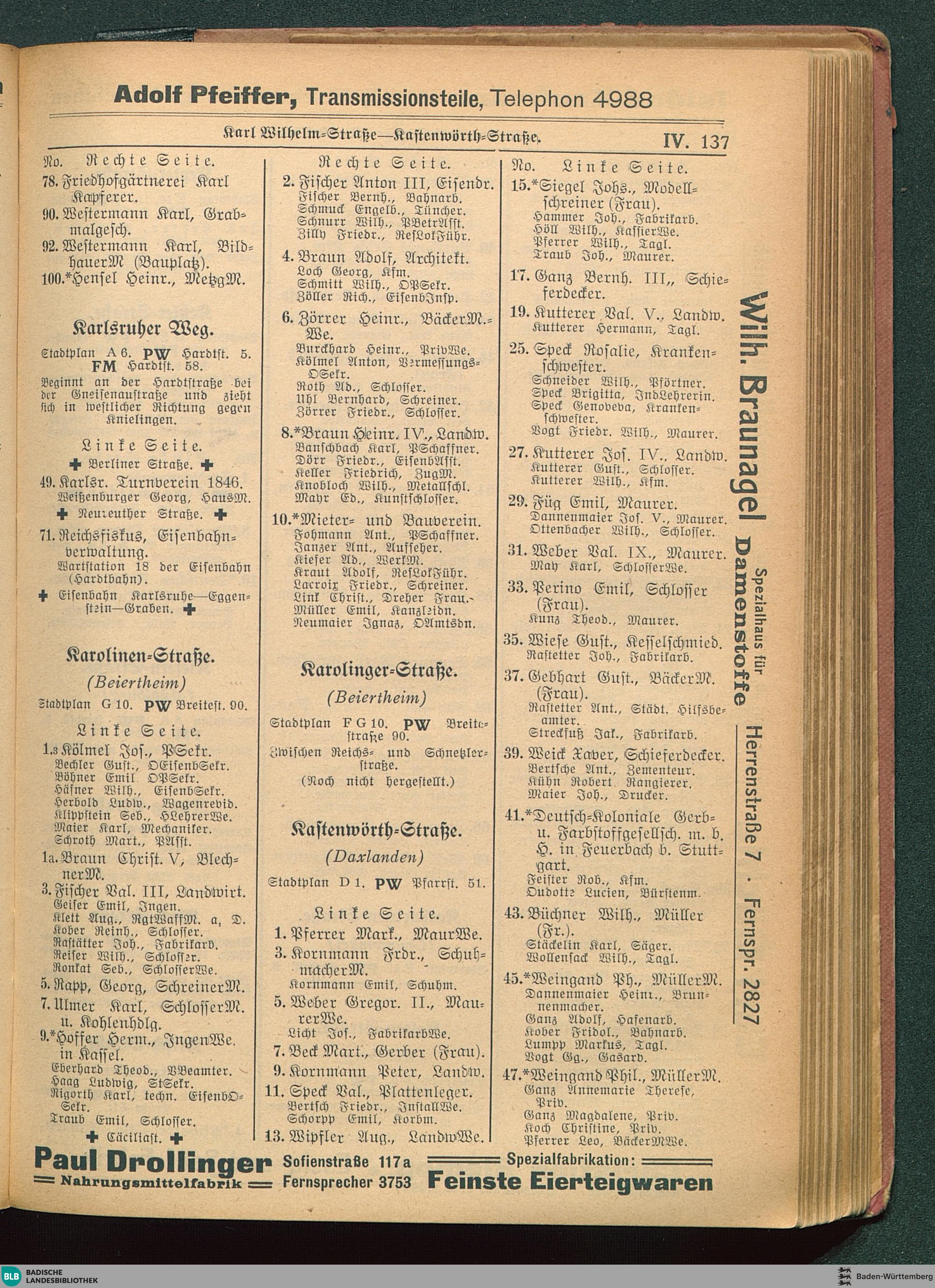 Adressbuch (Stadtbuch, Einwohnerbuch) der Landeshauptstadt Karlsruhe