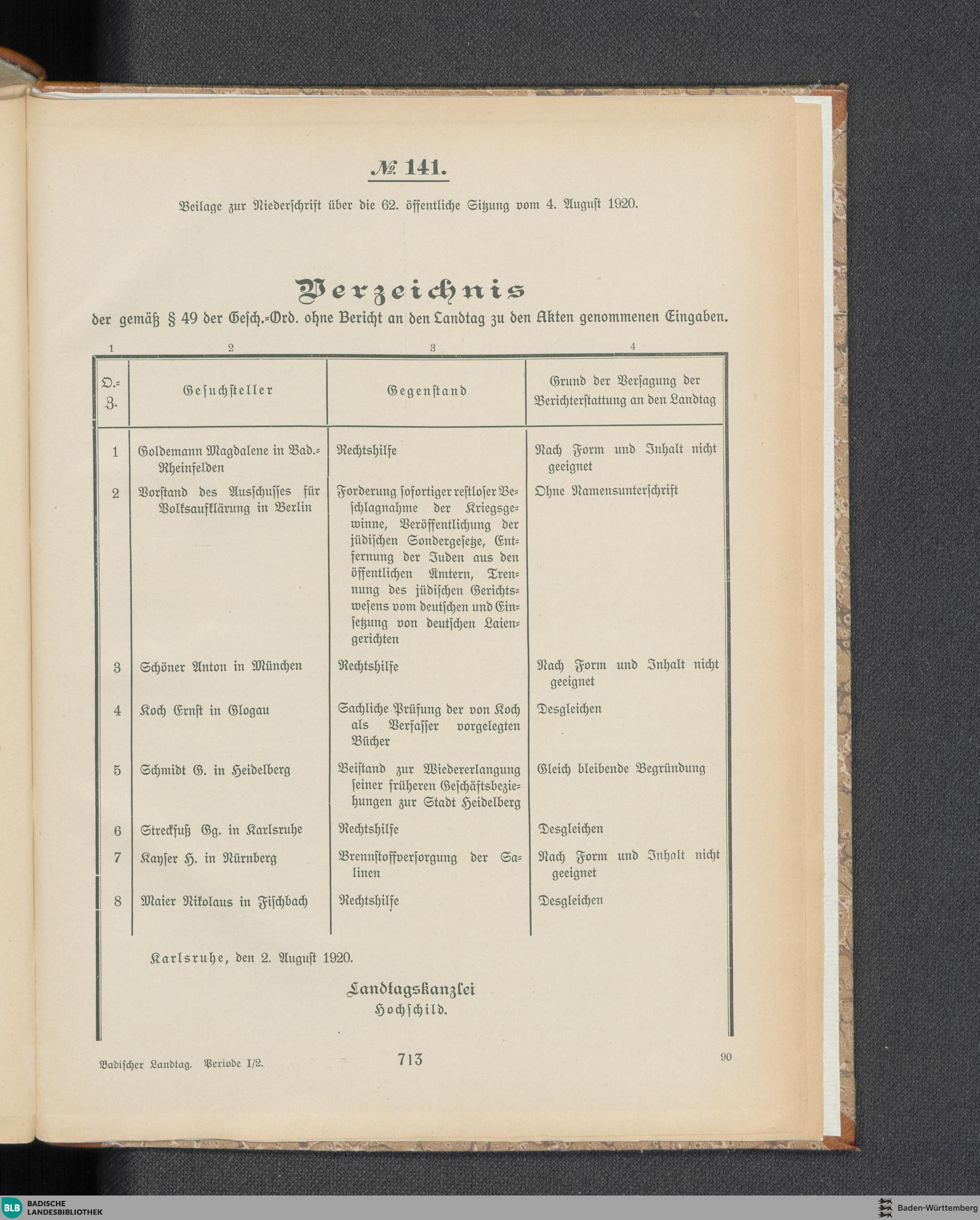 Beilagen zur 62. Sitzung (04.08.1920)