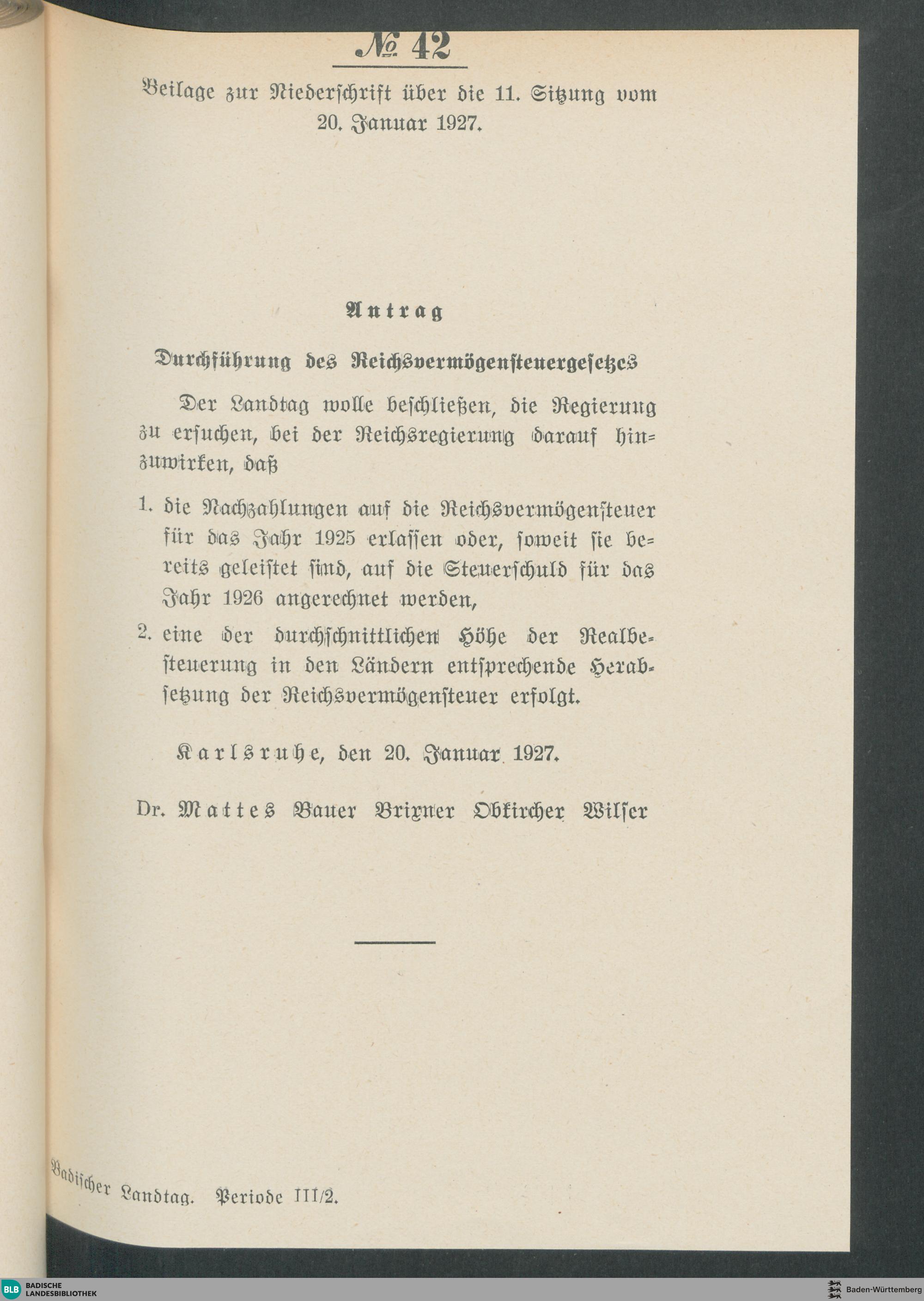 Beilagen zur 11. Sitzung (20.01.1927)