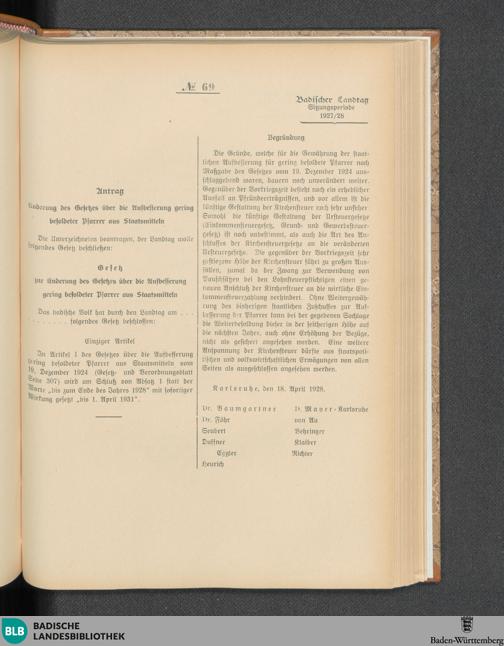 Nr. 69. Antrag. Änderung des Gesetzes über die Aufbesserung gering besoldeter Pfarrer...