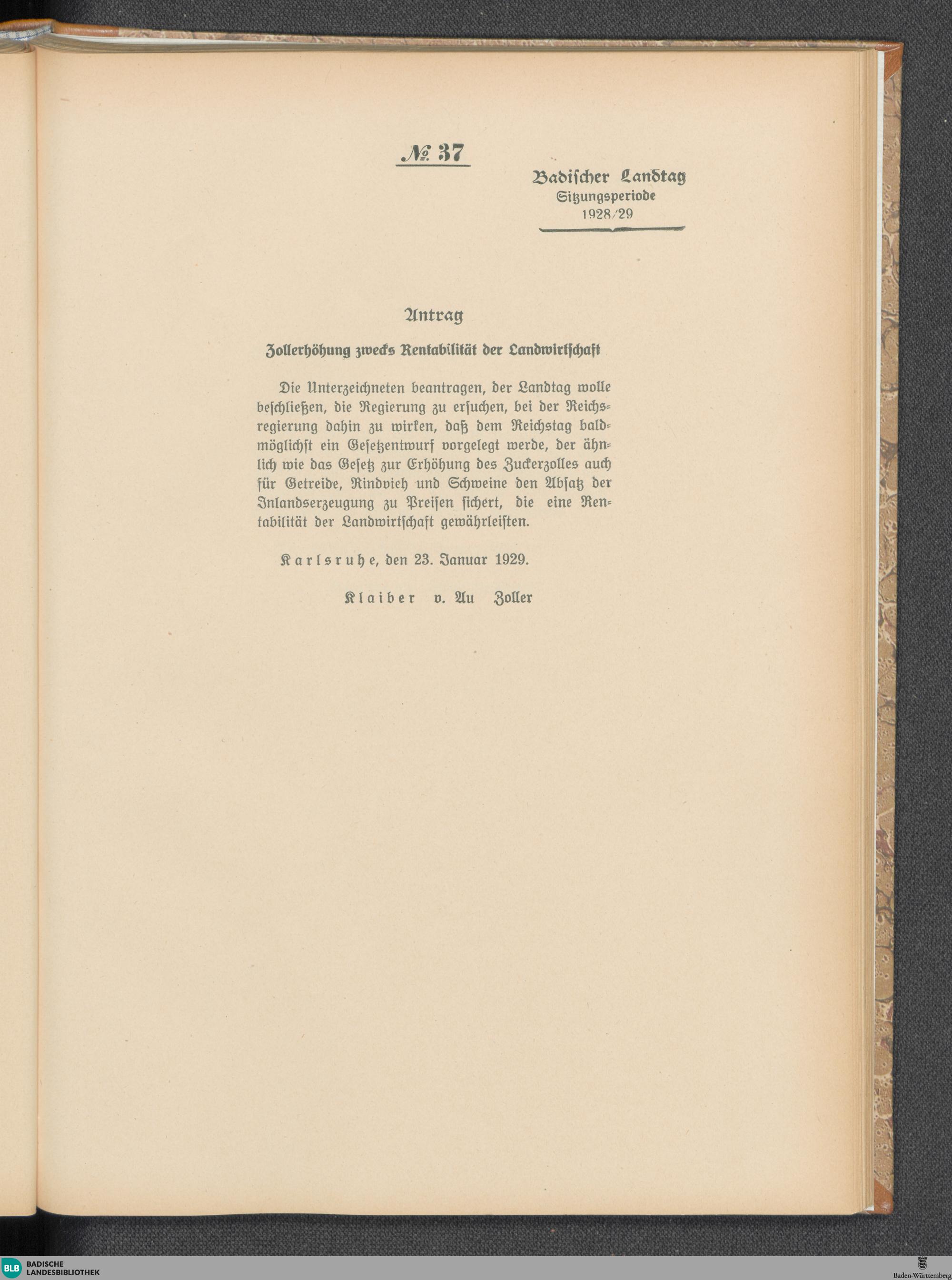 Nr. 37. Antrag. Zollerhöhung zwecks Rentabilität der Landwirtschaft