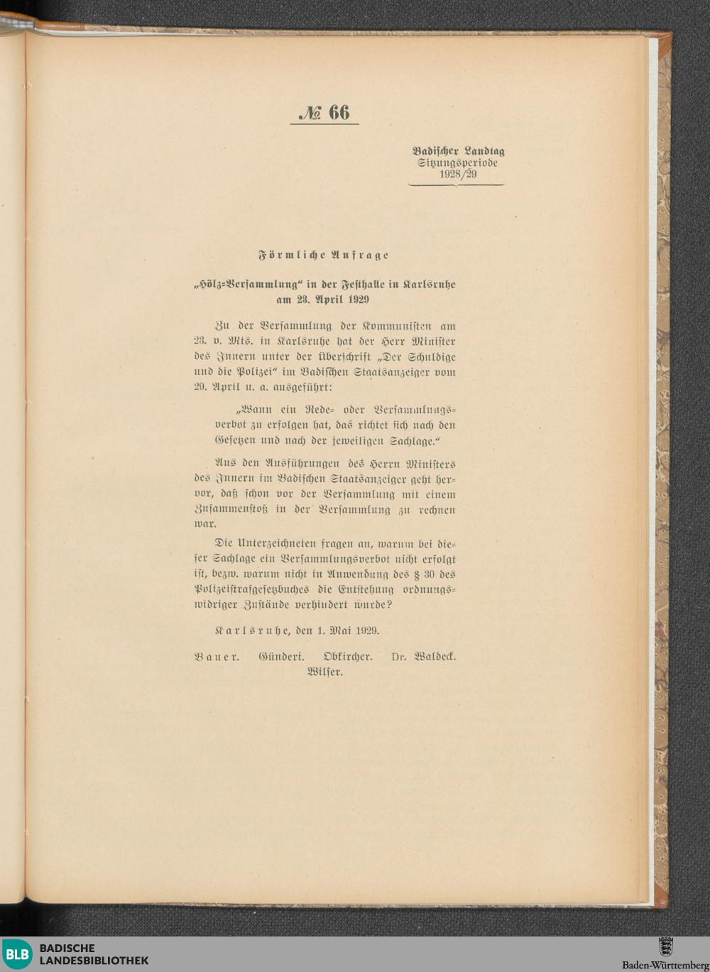 Nr. 66. Förmliche Anfrage. "Hölz-Versammlung" in der Festhalle in Karlsruhe am 23....