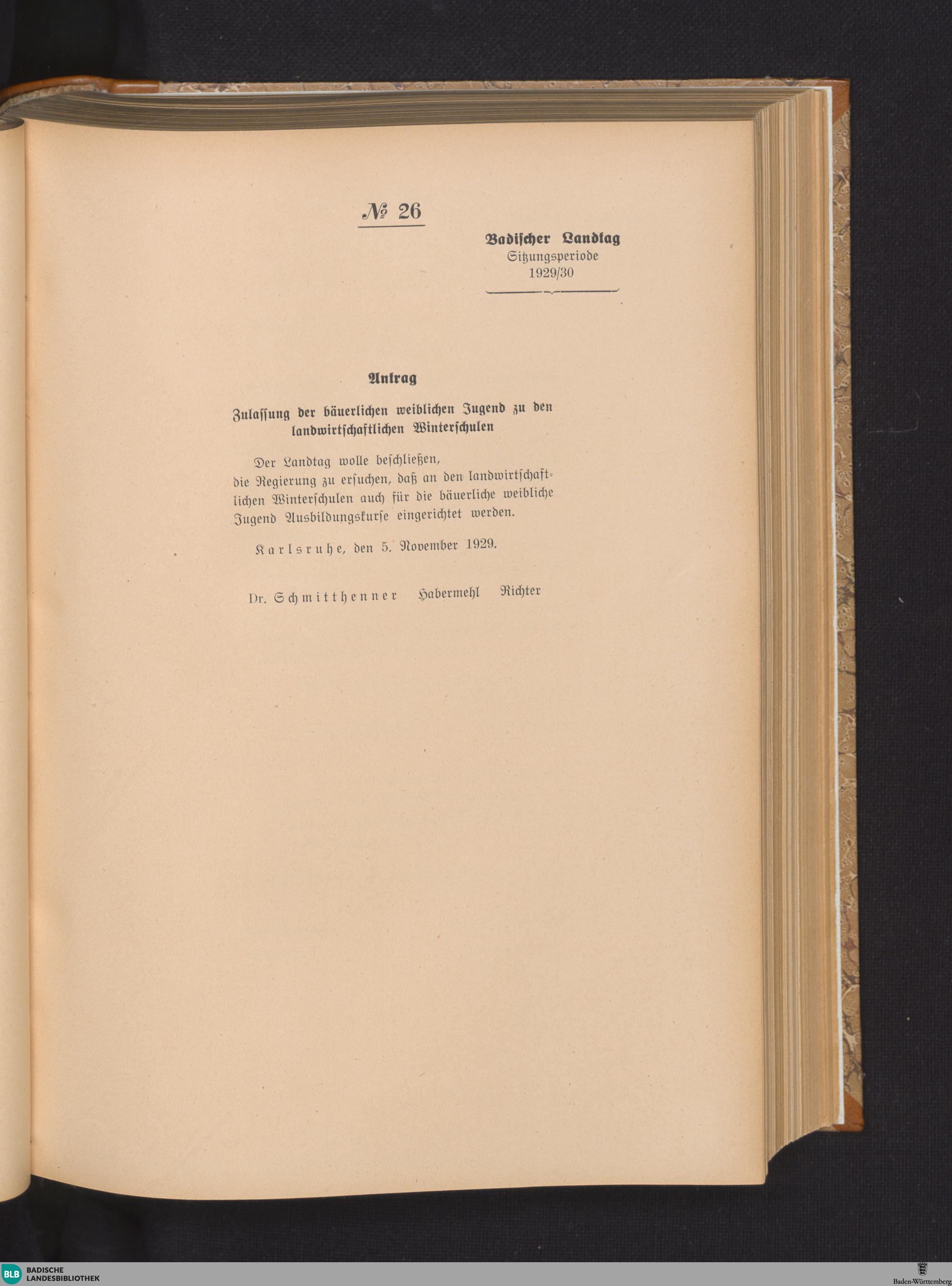 Nr. 26. Antrag. Zulassung der bäuerlichen weiblichen Jugend zu den landwirtschaftlichen...