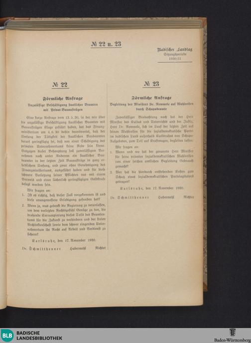 Nr. 22. Förmliche Anfrage. Unzulässige Beschäftigung staatlicher Beamten mit Pri...