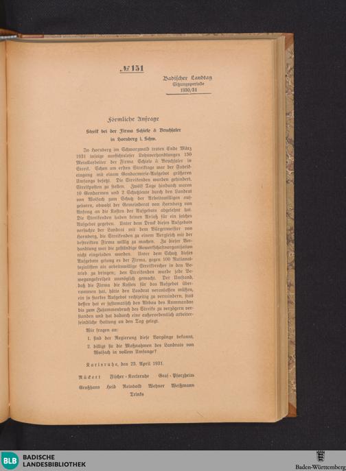 Nr. 151. Förmliche Anfrage. Streik bei der Firma Schiele und Bruchsaler in Hornberg...
