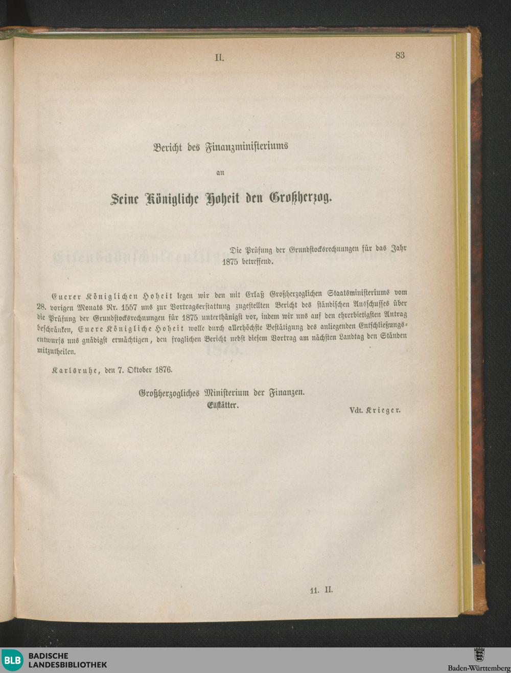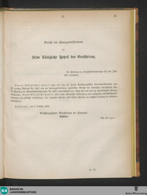 Bericht des Finanzministeriums an Seine Königliche Hoheit den Großherzog, die Prüfung...