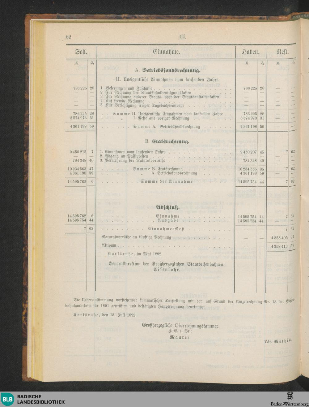 Summarische Darstellung der Hauptrechnung der Magazins- (Betriebsmaterialien-) V...