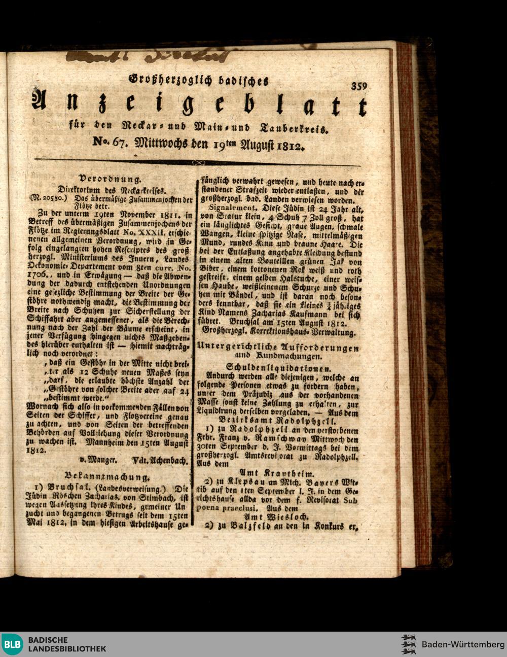 Großherzoglich Badisches Anzeige-Blatt für den Unterrhein-Kreis. 1810-1855