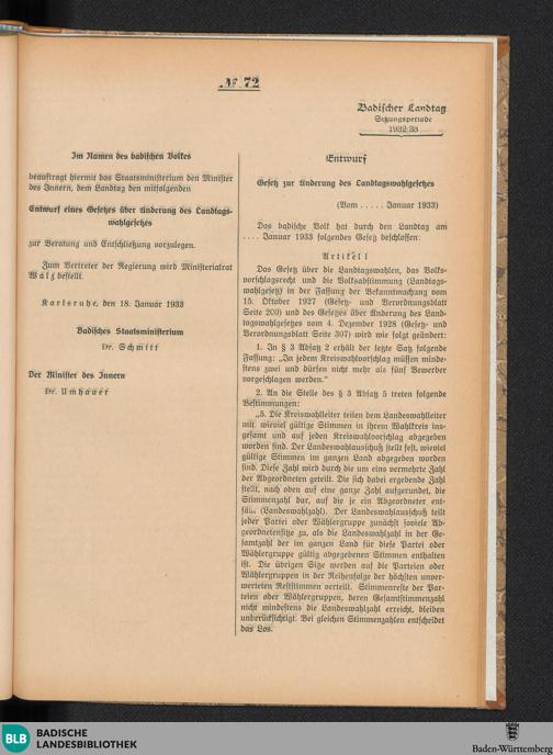 Nr. 72. Entwurf eines Gesetzes über Änderung des Landtagswahlgesetzes
