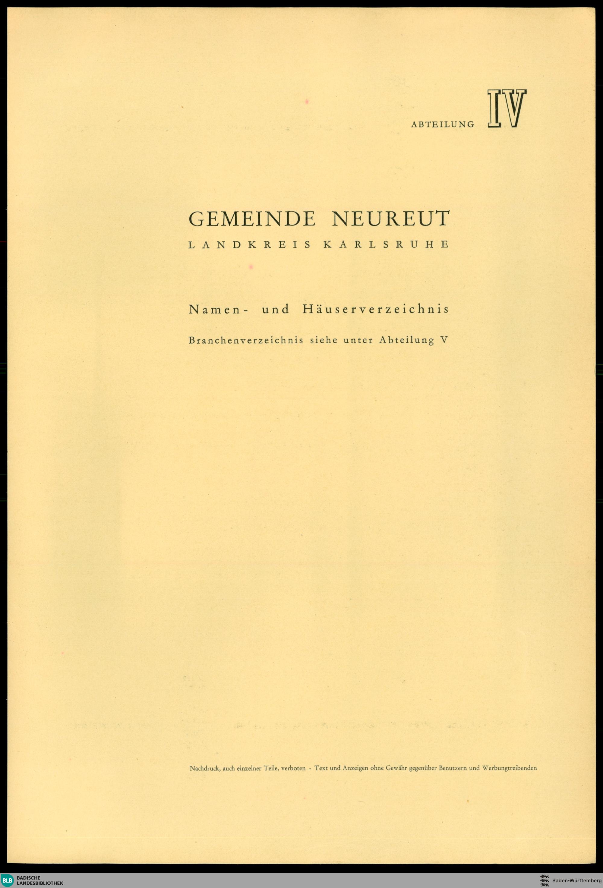 Abteilung IV: Gemeinde Neureut (Landkreis Karlsruhe): Namen- und Häuserverzeichn...