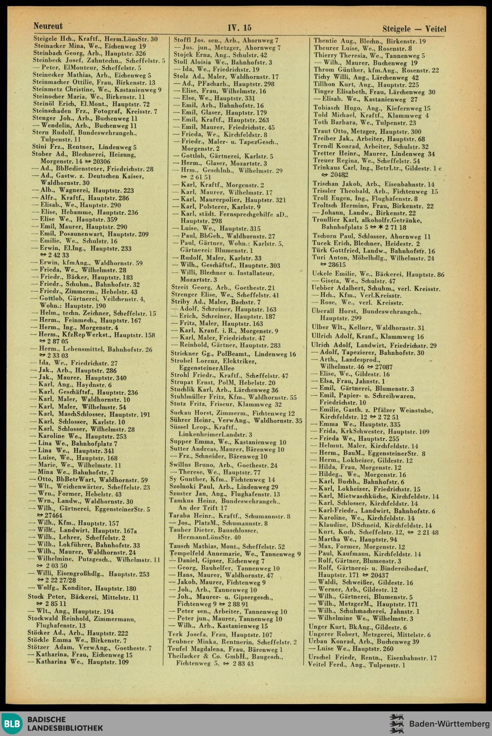 Abteilung IV: Gemeinde Neureut (Landkreis Karlsruhe): Namen- und Häuserverzeichn...